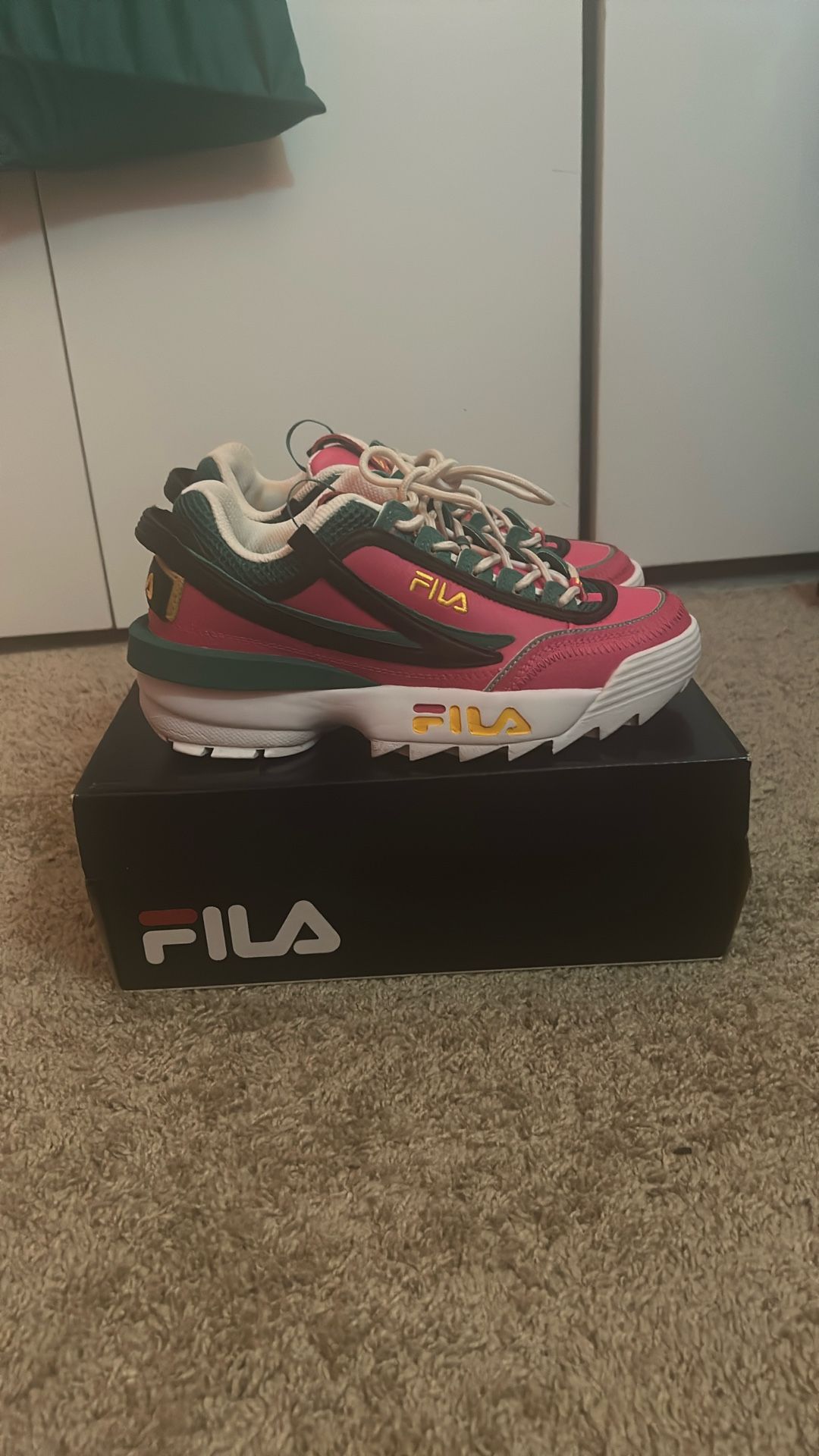 The Fila Disruptor II sneakers in size 8.5 have a vibrant pink and green colorway, featuring a low top style with a comfortable M width. This athletic shoe is designed for women and boasts the iconic FILA branding on the shoe's model. Made in Italy, these sneakers are part of the FILA Disruptor product line, known for their colorful and bold designs. Perfect for adding a pop of color to any casual outfit, these sneakers are a stylish choice for those who appreciate athletic footwear with a trendy twist.