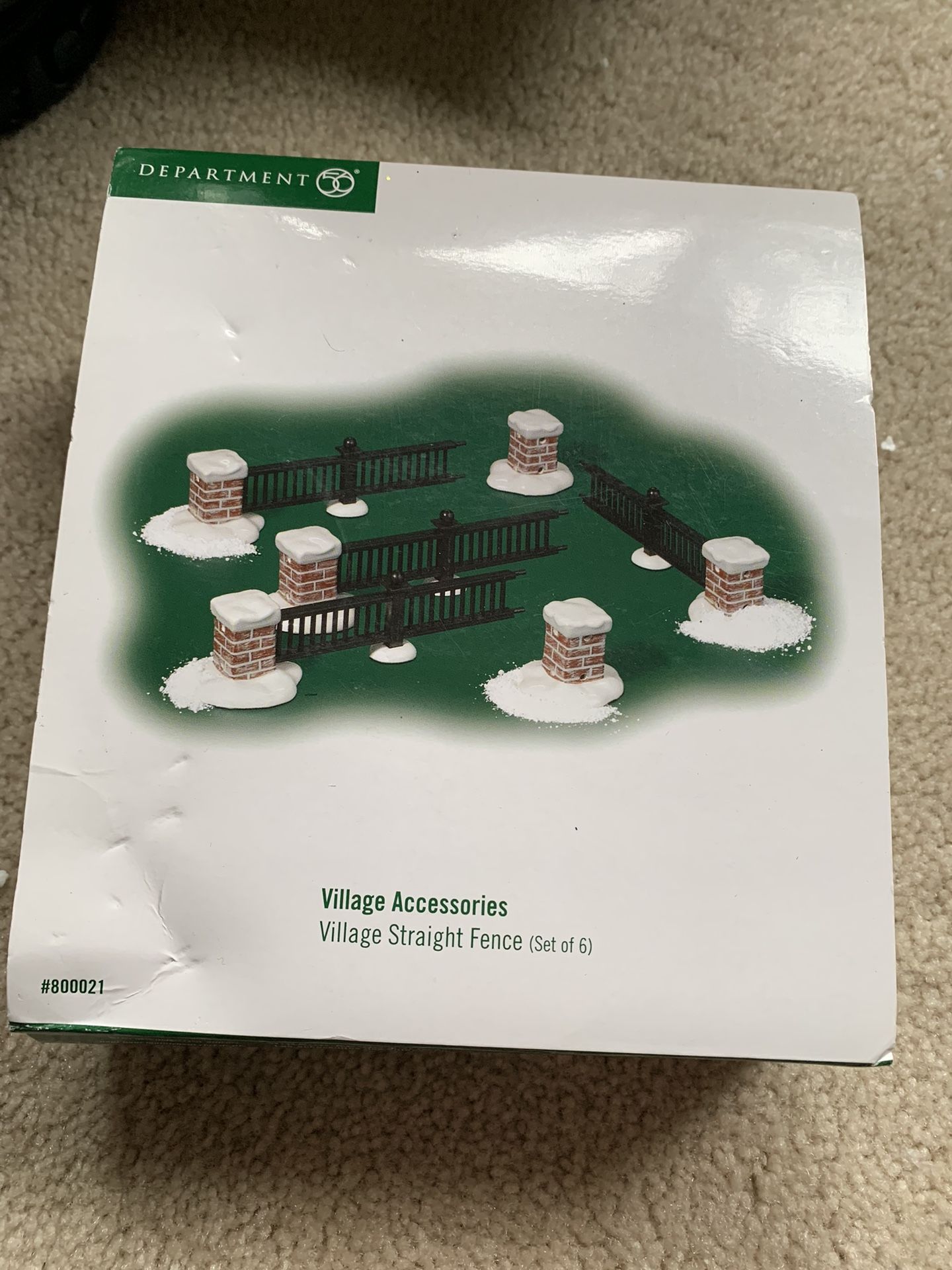 Department, 56 snow village accessories, village straight fence set of six. One of the pillars are broken and one of the fence connecting into the pillars is a little broken. The rest of it works and is in good condition just those two pieces are damaged.