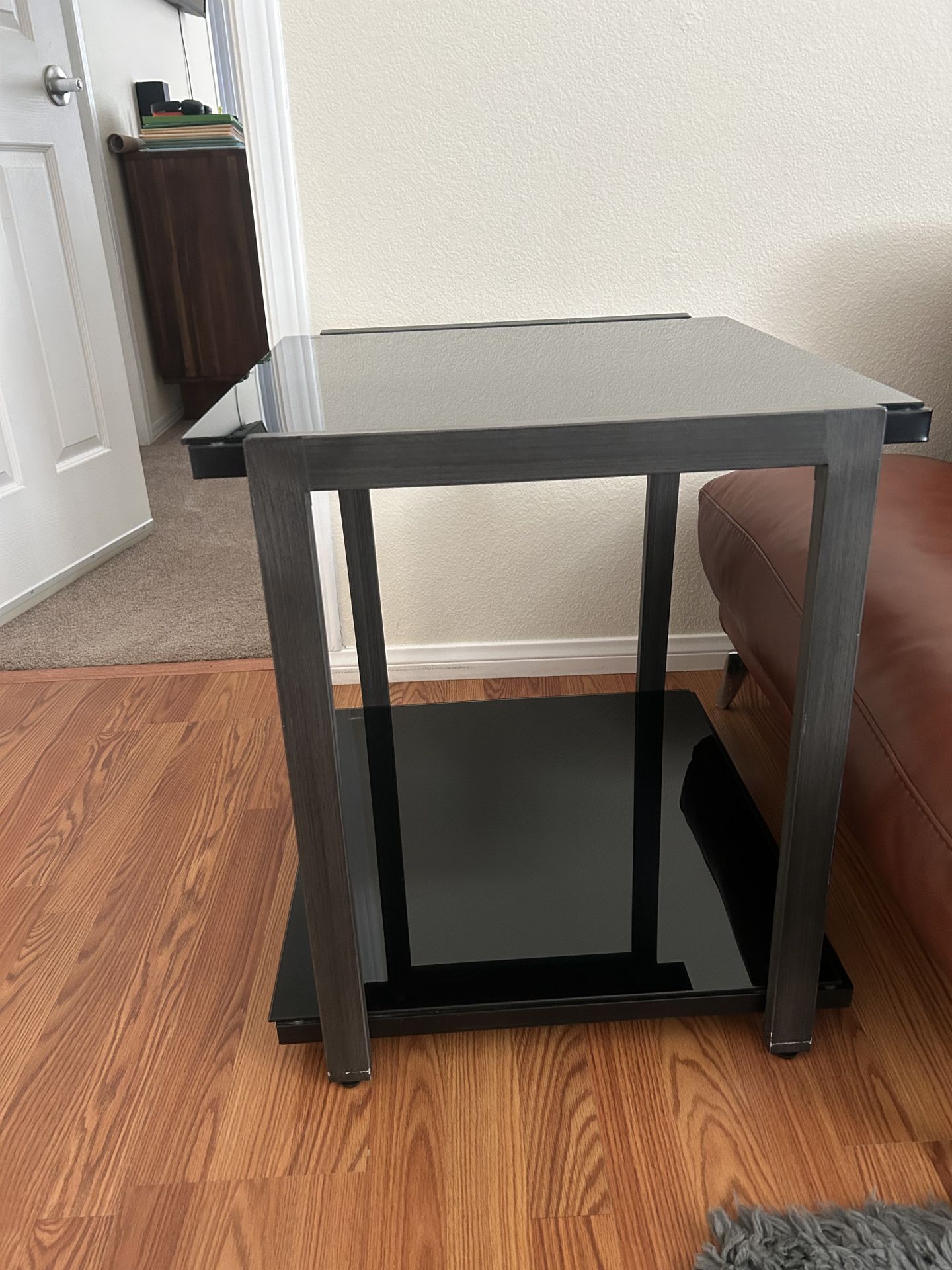 Hello I have a center coffee table black glass with the pair of two single tables. The center table has a few lines on the glass due to my son putting his toys on there to play but nothing major. These are used, the paint of the frames have normal scuffs but nothing serious. I can let go of all 3 or individuals if you like.