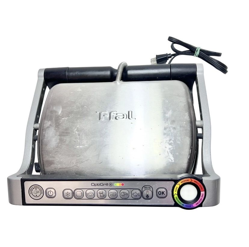 Introducing a T-Fal OptiGrill indoor kitchen meat grill, with automatic sensor, model 8356S1. Features versatile grilling with automatic cooking programs. This item is in good used condition. You will receive the exact item pictured. Please contact us with any questions or concerns. Customer satisfaction is our priority. Thank you! The Happy Face Shop
