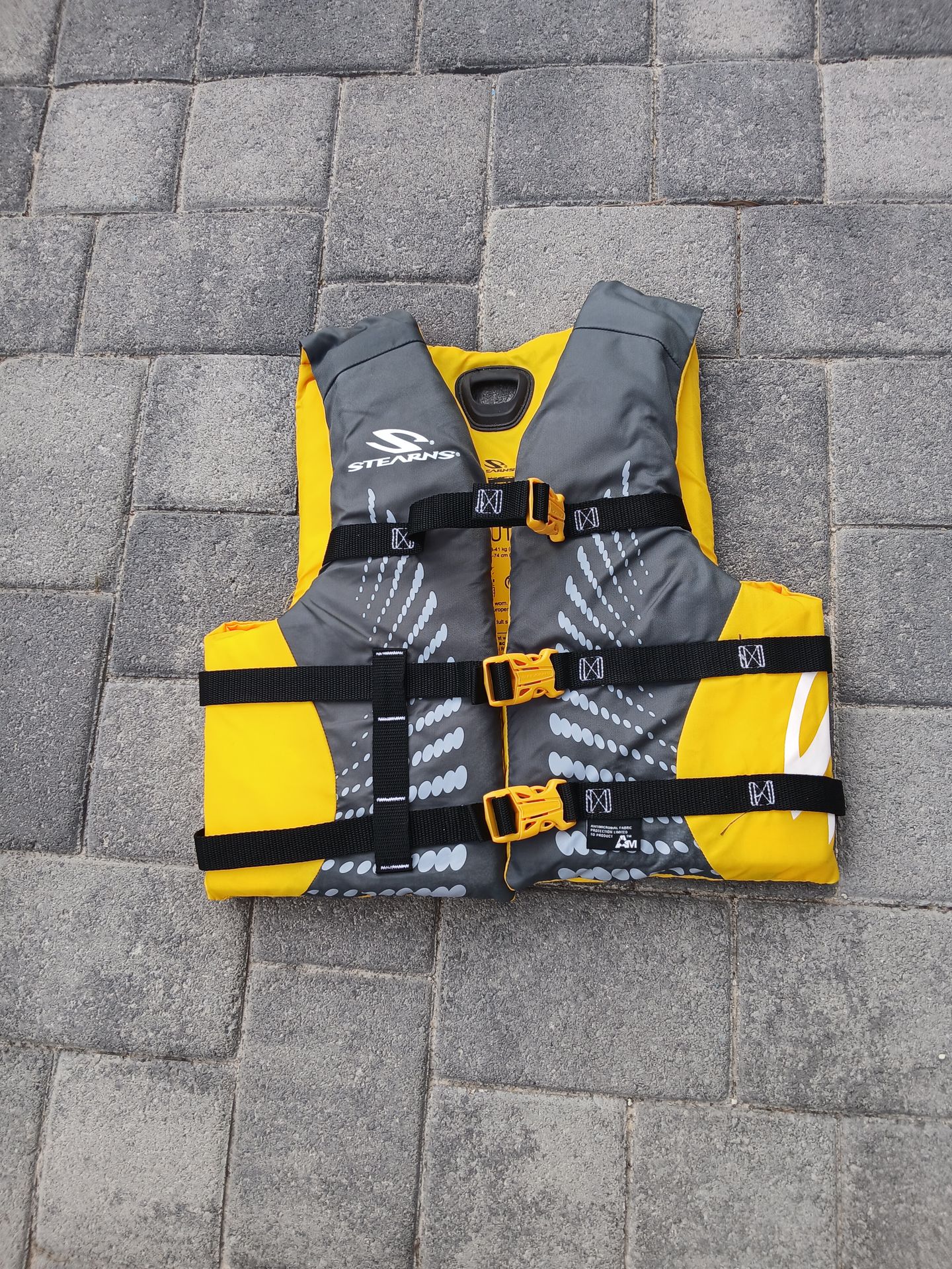 This item is a Stearns Youth Nylon Boating Vest. It is a US Coast Guard-approved Type III PFD. Designed for youth weighing 50-90 lbs (23-41 kg). Features three adjustable chest belts for a secure fit. The fabric is treated with antimicrobial protection to inhibit odor-causing bacteria, mold, and mildew.