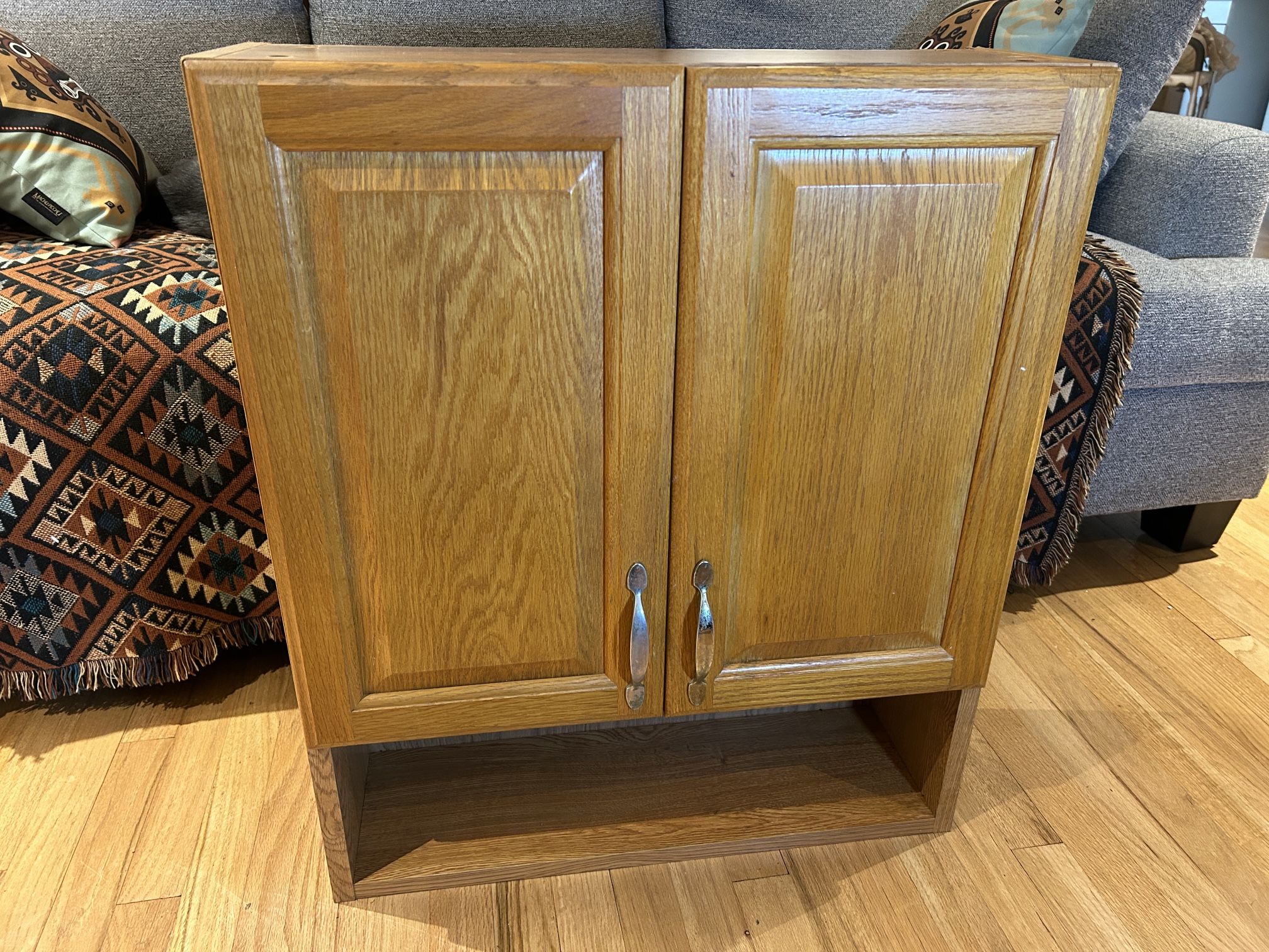 Mill’s Pride hanging bathroom cabinet. Doors appear to be wood, body is veneered mdf. One shelf in the interior. Sturdy cabinet in good condition. 24” W x 9” D x 29” H