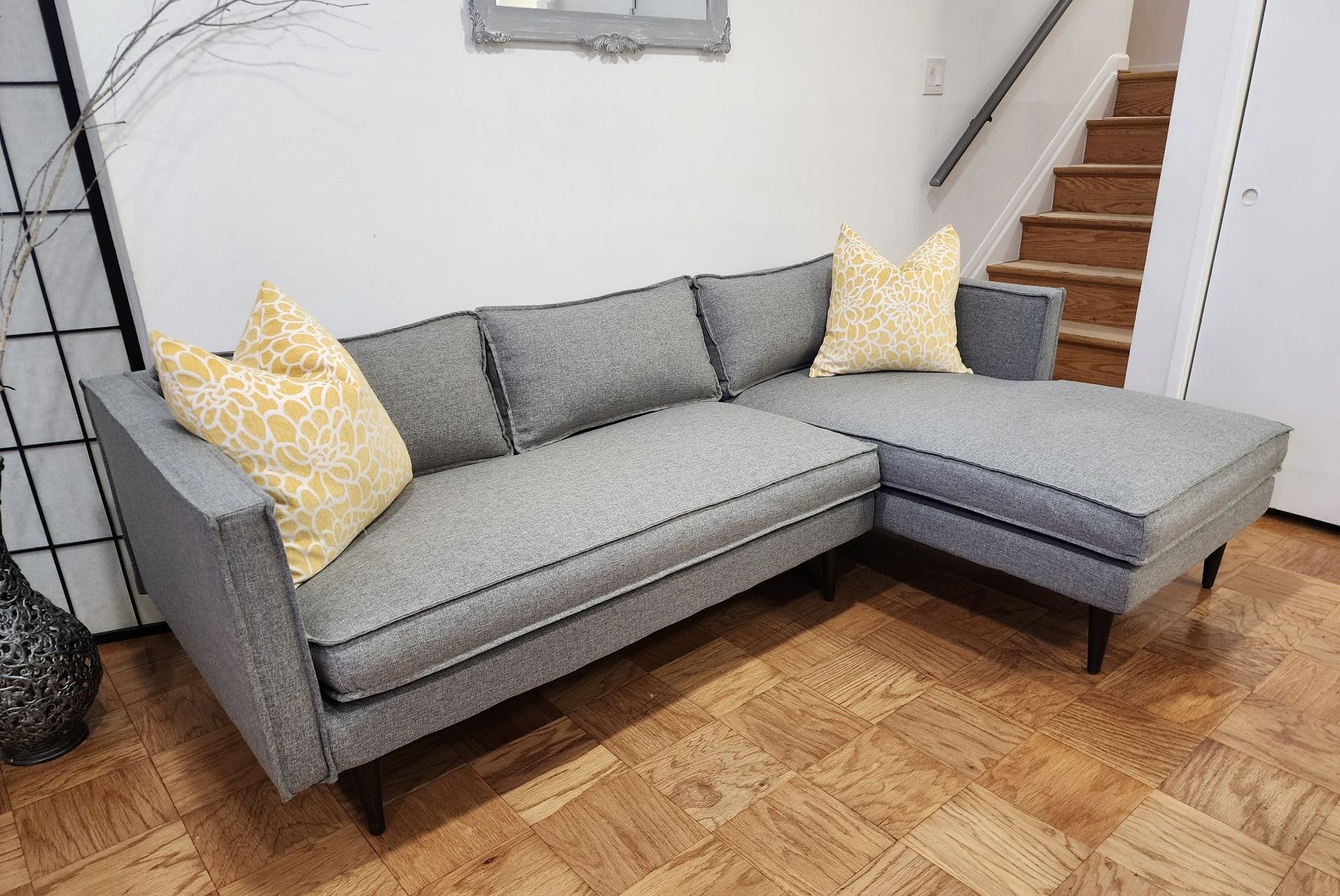 Joybird Sectional Sofa in very good condition. It doesn’t have rips, no stains, no pilling. This sofa is structurally very well made with high quality materials. It’s comfortable and very clean. Pets and smoke free home. Cushion covers are removable and washing machine. It can be dissemble into 2 pieces for easy transportation. * yellow decorate pillows not included it* Dimensions: Overall 90”W x 28”H x 35.5”D without chaise x 60”D with chaise