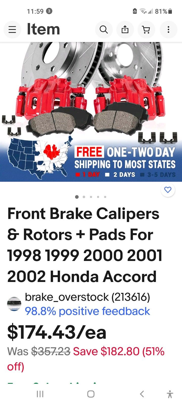 Honda Accord Front Brake Calipers & Rotors +pads . I had a pair on a honda accord 2002 2 door coupe ex . And a 4 door ex .new never used .asking 100.00