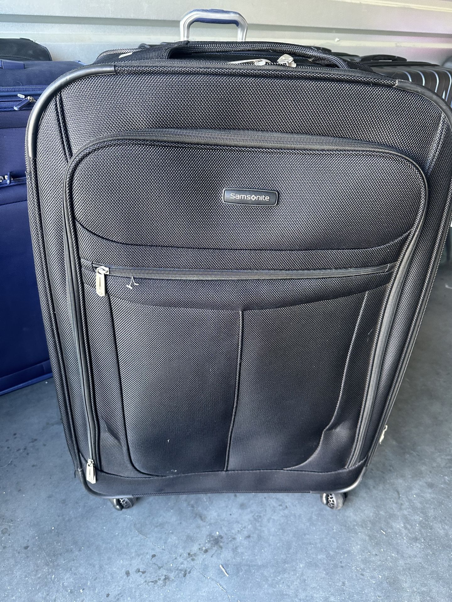 This large Samsonite suitcase is built for serious travel with a tough hard shell, smooth spinner wheels, and a telescoping handle. It’s clean, rolls great, and has plenty of space for extended trips. Features: • Size: 28–30” Check-In (ideal for longer travel) • Shell: Textured polycarbonate with horizontal ridges for impact resistance • Mobility: 360° spinner wheels for smooth rolling • Interior: Zippered compartments and tie-down straps • Security: Zippers work perfectly (no lock included