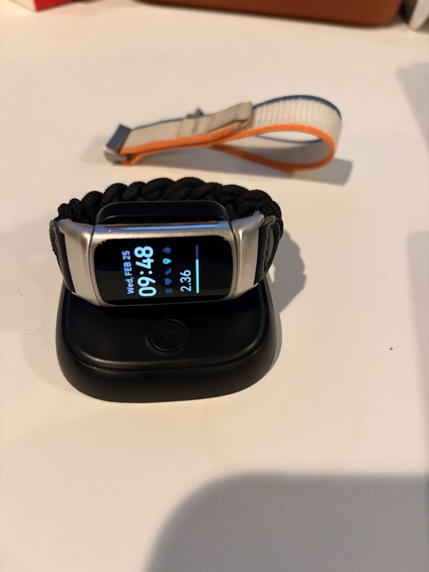 In excellent condition Fitbit Charge 6. Bought new. I unfortunately lost the box with the original strap and cable. I am including a desktop charger and 2 bands as shown. Very low usage. Moving to a whoop band.