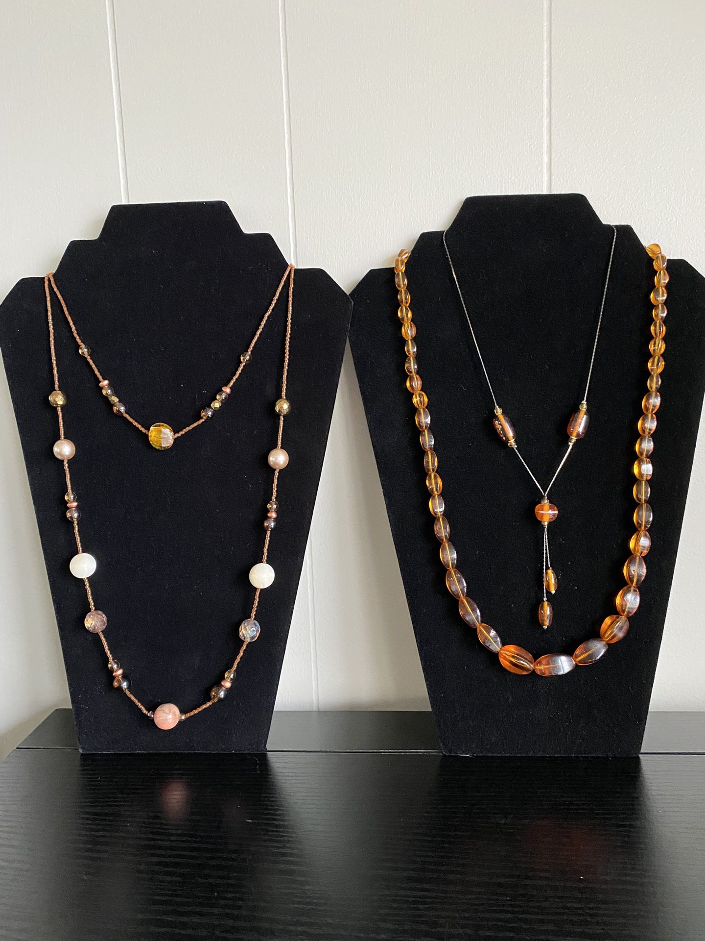 3 Brown Necklaces lot. Comes with two tier necklace.. upper level 20” lower level 33” long. Metal and Brown beads is 18” long. Glass bead necklace is 28” long. Pickup in Lakewood no holds