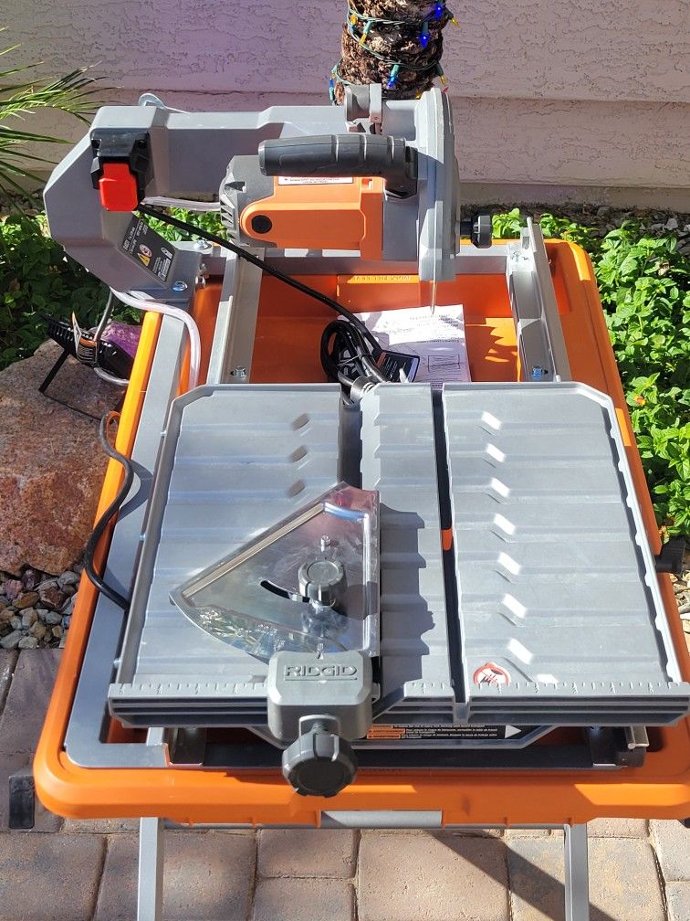 Very lightly used- RIDGID 9-Amp 7 in. Blade Corded Wet Tile Saw with Stand. Retail $369, $200 Firm