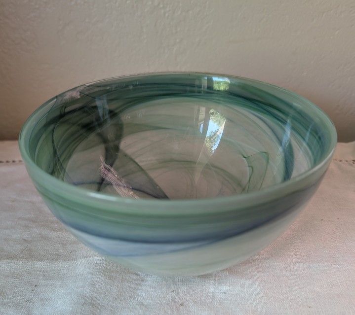 Gorgeous and durable, this art glass bowl is perfect for your dining and serving needs or for display. It's really nice to look at with whispy swirls of green and blue in the glass.