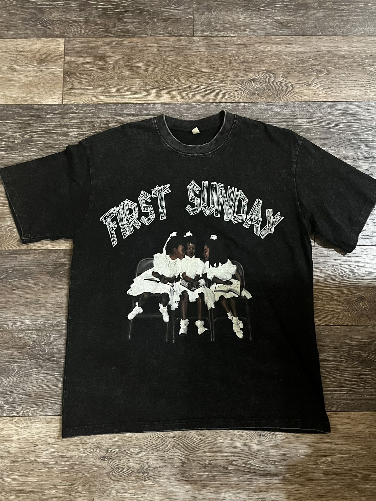 Kanye West “First Sunday” Graphic T-Shirt (Black) Rare Kanye West “First Sunday” graphic tee featuring a vintage-style black wash and front graphic of children seated with bold text above. Soft cotton feel with a slightly oversized, boxy fit. Unique and eye-catching piece for Kanye or streetwear fans. Condition: Good / worn-in vintage look