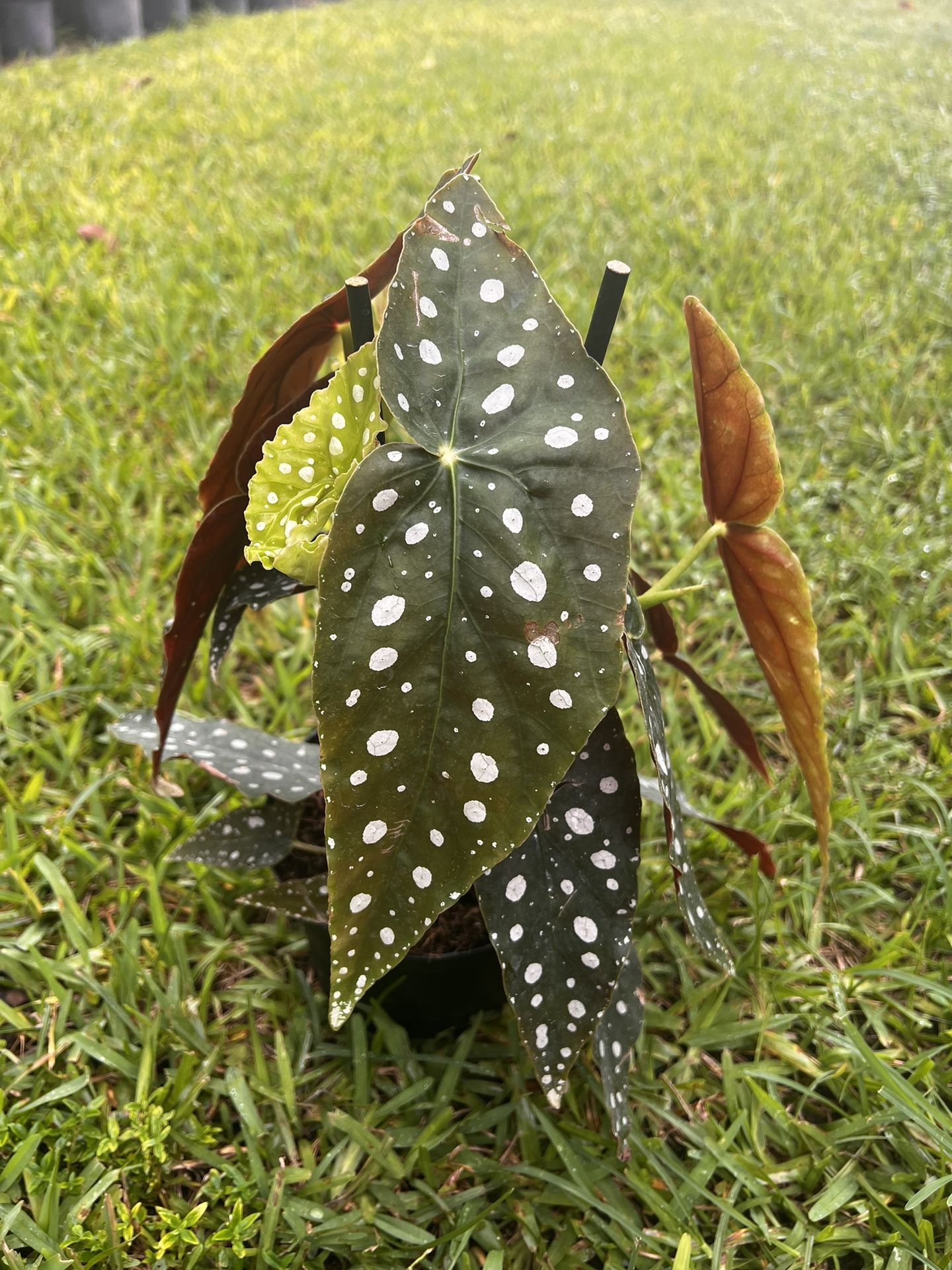 The Begonia Maculata is actually quite a friendly and easy-going plant and it has a nice surprise for you when you keep it happy. It will grow a beautiful flower for you. Light: Bright, indirect light. Higher light levels will promote strong growth and even flowering, but avoid direct sunlight. Water: Keep the soil generally moist, letting the top few centimeters of soil dry out between watering. Will not tolerate soggy soil.