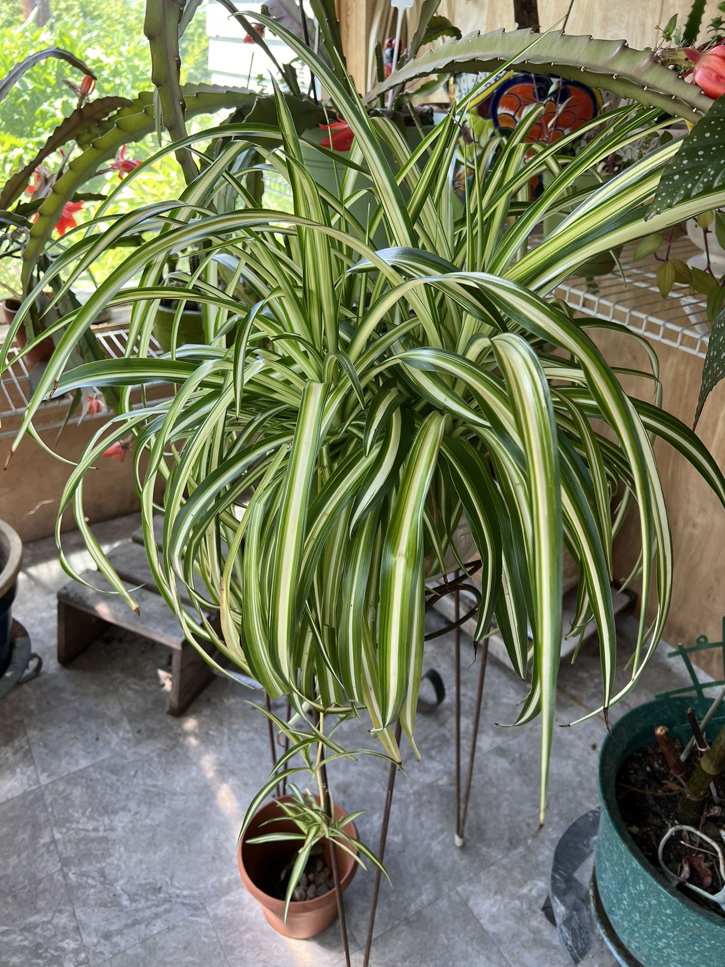 Green stripes potted spider plant. Also known as Spider Ivy, Ribbon Plant, walking plant, Athericum, Curly Spider, Airplane Plant, St. Bernard’s Lily, Hen and Chicken.