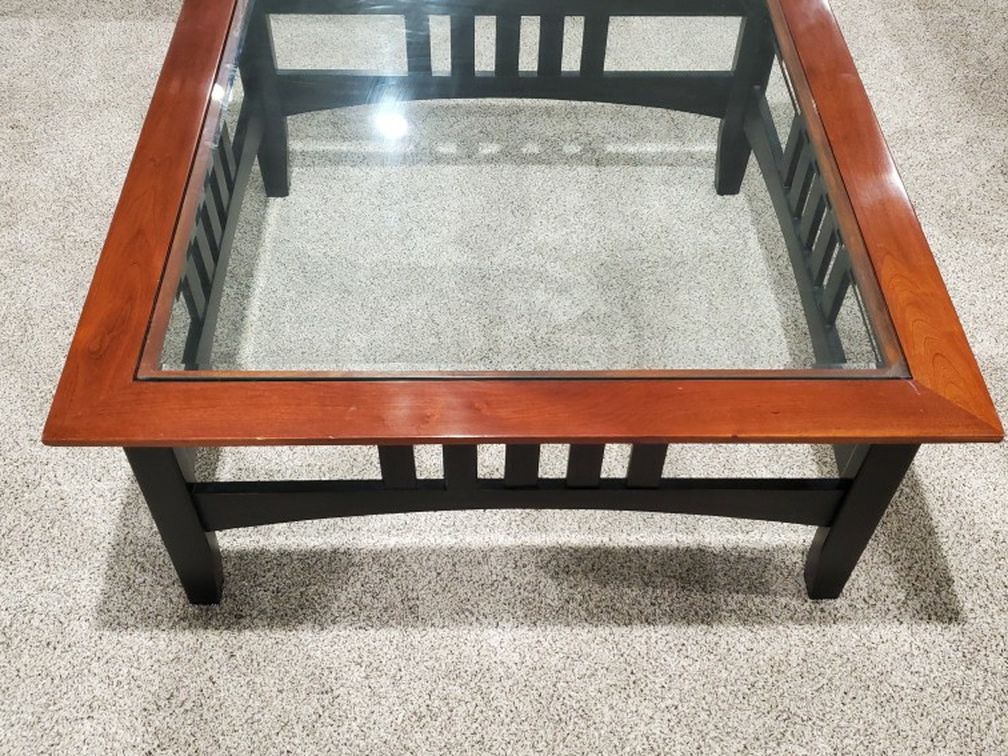 Craftsman Design Vintage Cherry Coffee Table With Black Base and Beveled Glass, Ethan Allen
