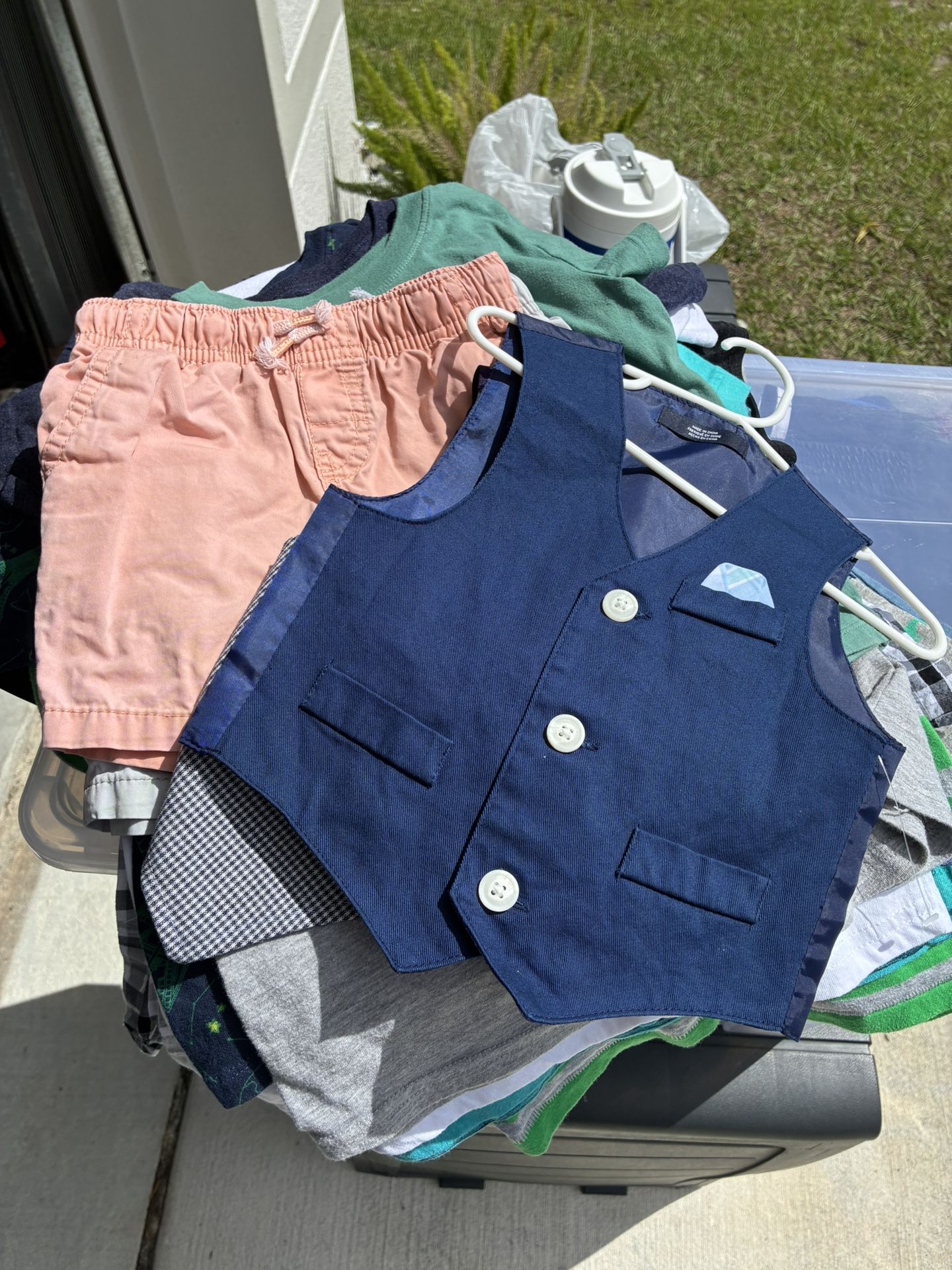Shirts, shorts, pants, jackets, pajamas, shoes and costumes (Captain America, shark and a lion). Sizes vary. If I had to guess, most are 4t. They should all fit a child 3-5 years old. There are a few things new with tags. Pick up in Palm Bay. Bin not included