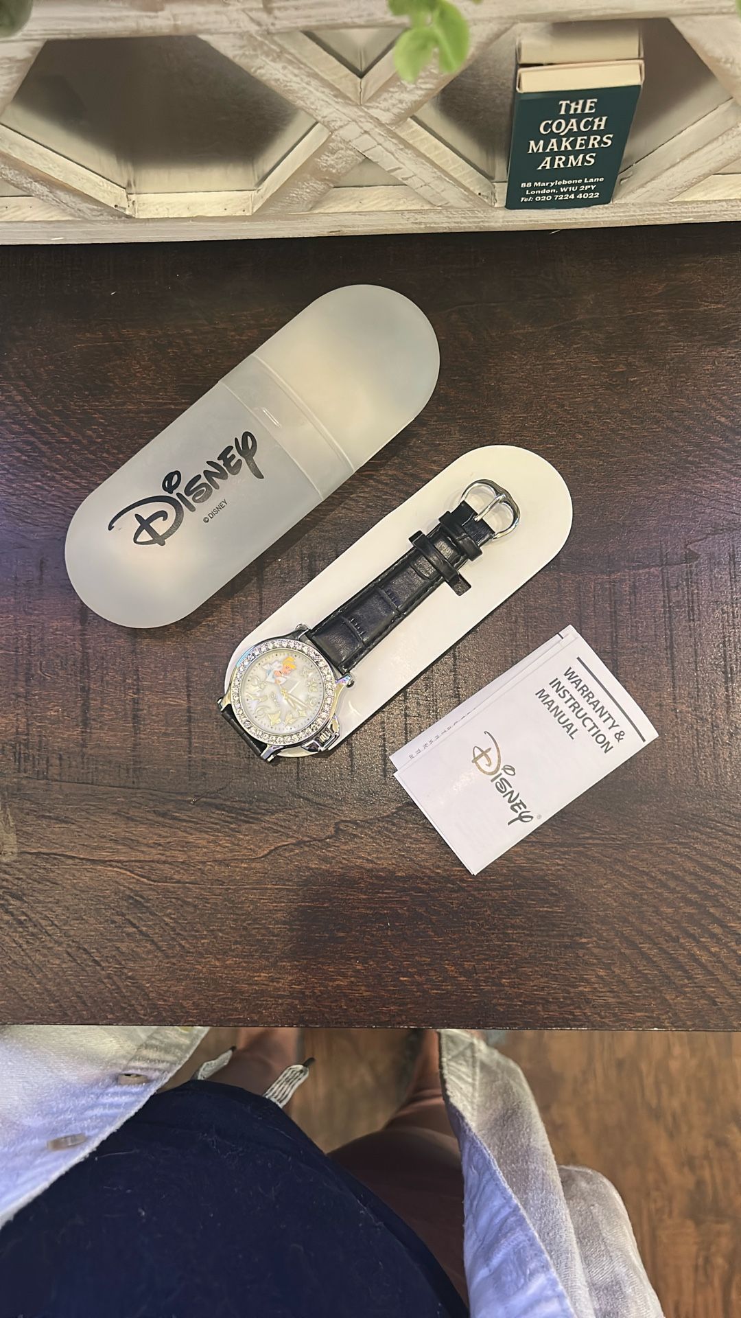 Official Disney watch featuring Cinderella on the face with leather straps and crystals. Water resistant and stainless steel case back.