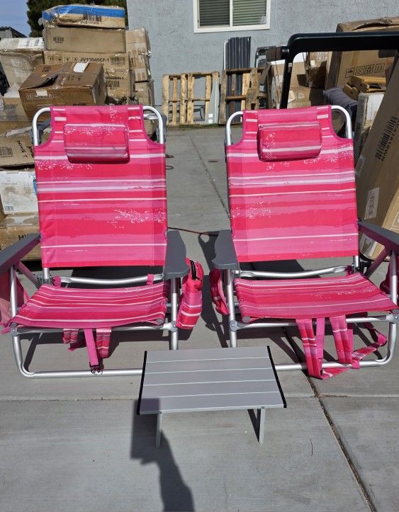 2 chairs and 1 table. Backpack straps for easily travel. Portable and perfect for the beach, traveling, backpacking, or camping. These items are used but in excellent condition. Measurements are on the second to last picture. Check out my other listings for more related items. Located off Yucca Loma Rd and Apple Valley Rd in the city of Apple Valley
