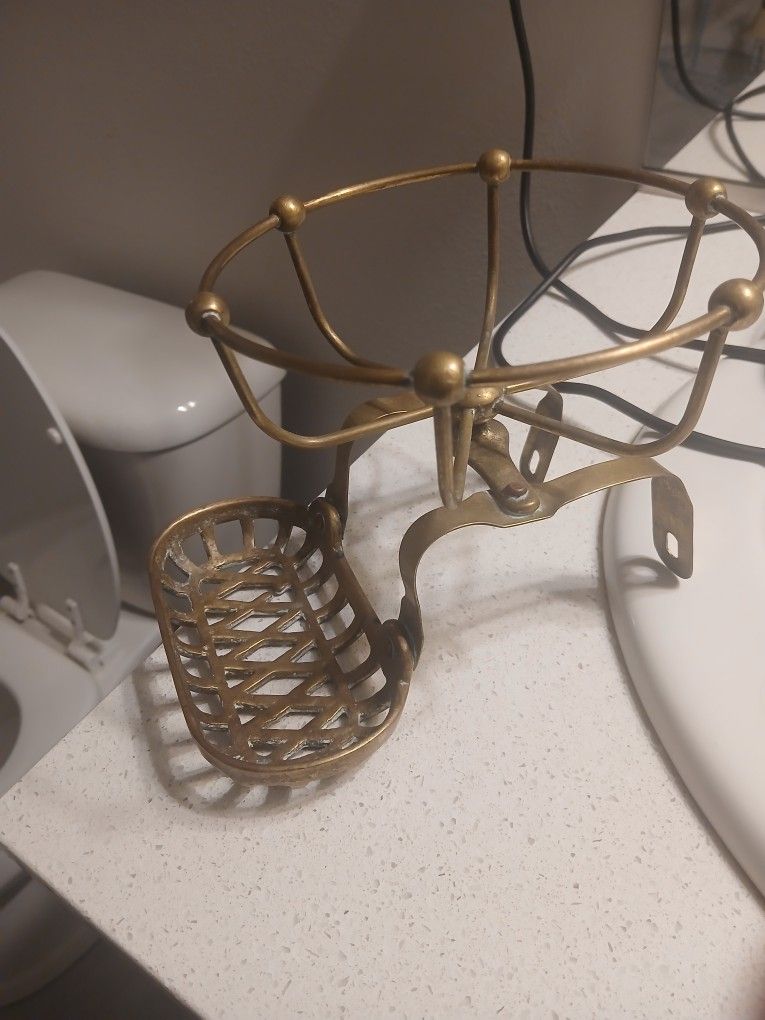 Brass over-the-tub soap and sponge holder. Can also be mounted to the wall. Measures 6-1/4" high x 6-1/2" across the sponge holder. Measures 7" deep from the wall if mounted. In good vintage condition.