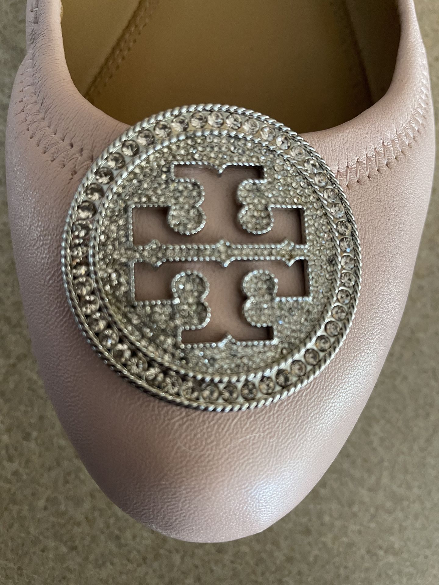 Tory Burch Liana Ballet Flats – Seashell Pink Nappa Leather Rhinestone Logo – Women’s Size 9 w/ Box