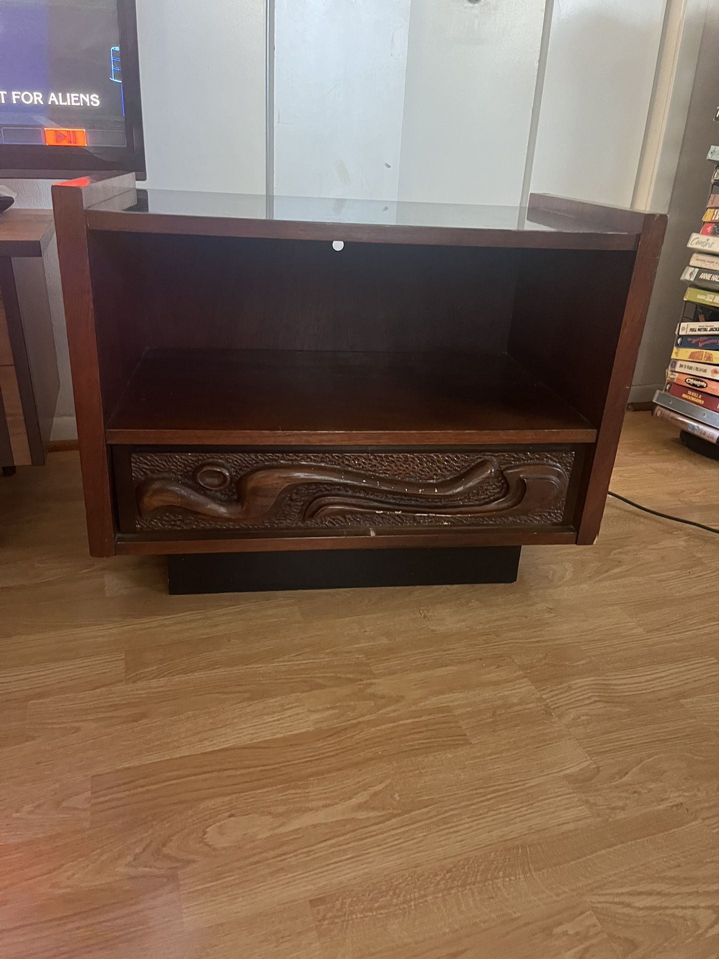 Here is a rare find- “Contour 70’s” by Pulaski, designed by Leonard Eisen. In Mad Men, they used the credenza that matches this. As shown on the original ad, it’s made of “rosewood vaneers with selected solid wood components.” Measurements are shown in pictures, approximately 28” wide, 16 inches deep, 22 inches tall to where it meets the wood, but the table itself is closer to 21 inches tall. It has some flaws as shown in photos, there is a few small chips, would be easy to fix up. Let me know if you are interested, I am open to offers! There is one selling for $2500 on Cherish, a pair usually sells for $2500.