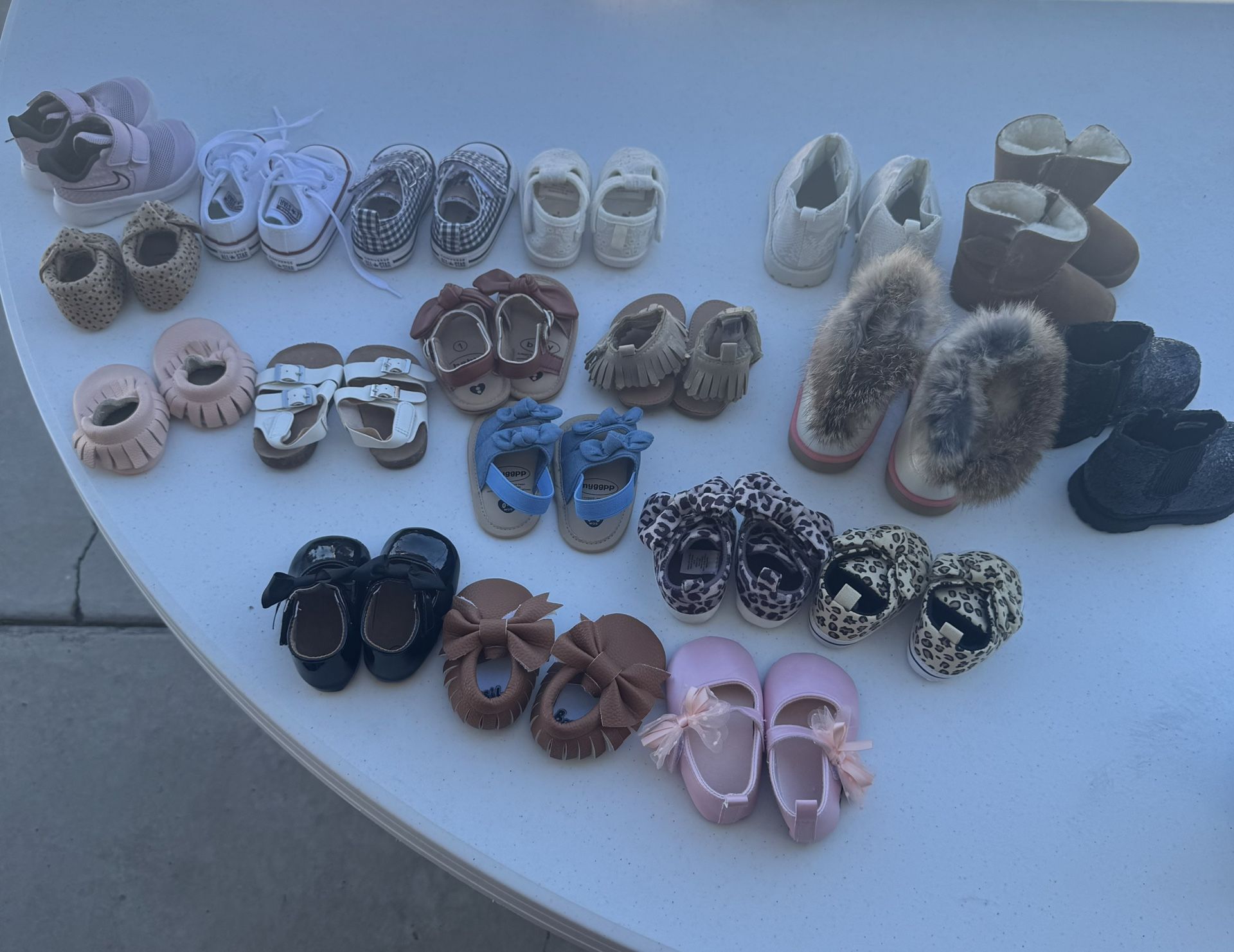 Converse/tennis shoes- size 2 Sandals and others mostly 6-12 months Uggs 2/3 Carter Boots- size 4 You must take entire lot