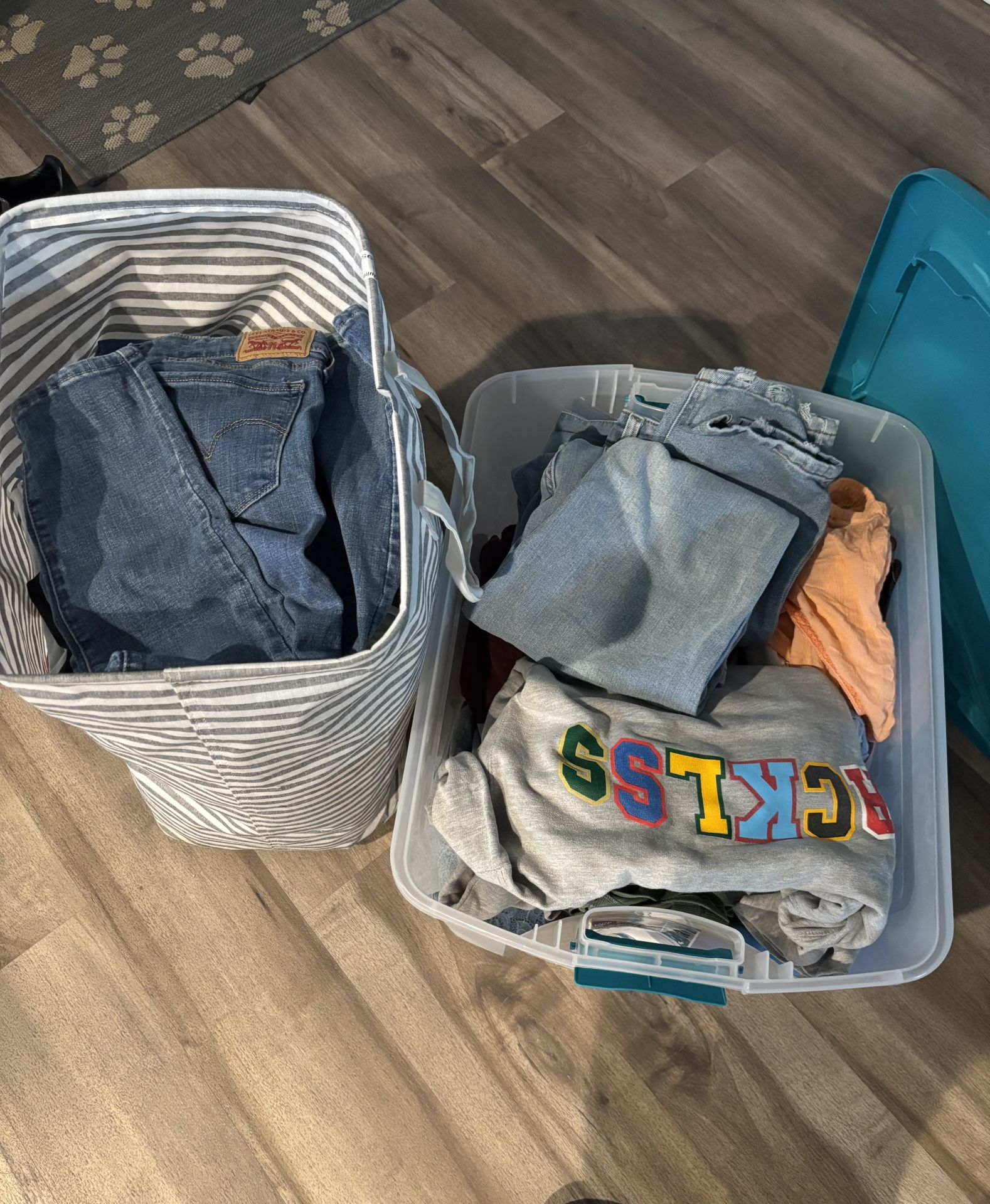 Bin and Hamper full of various junior clothes. Good brands and many jeans included. Clothes is very well taken care of.