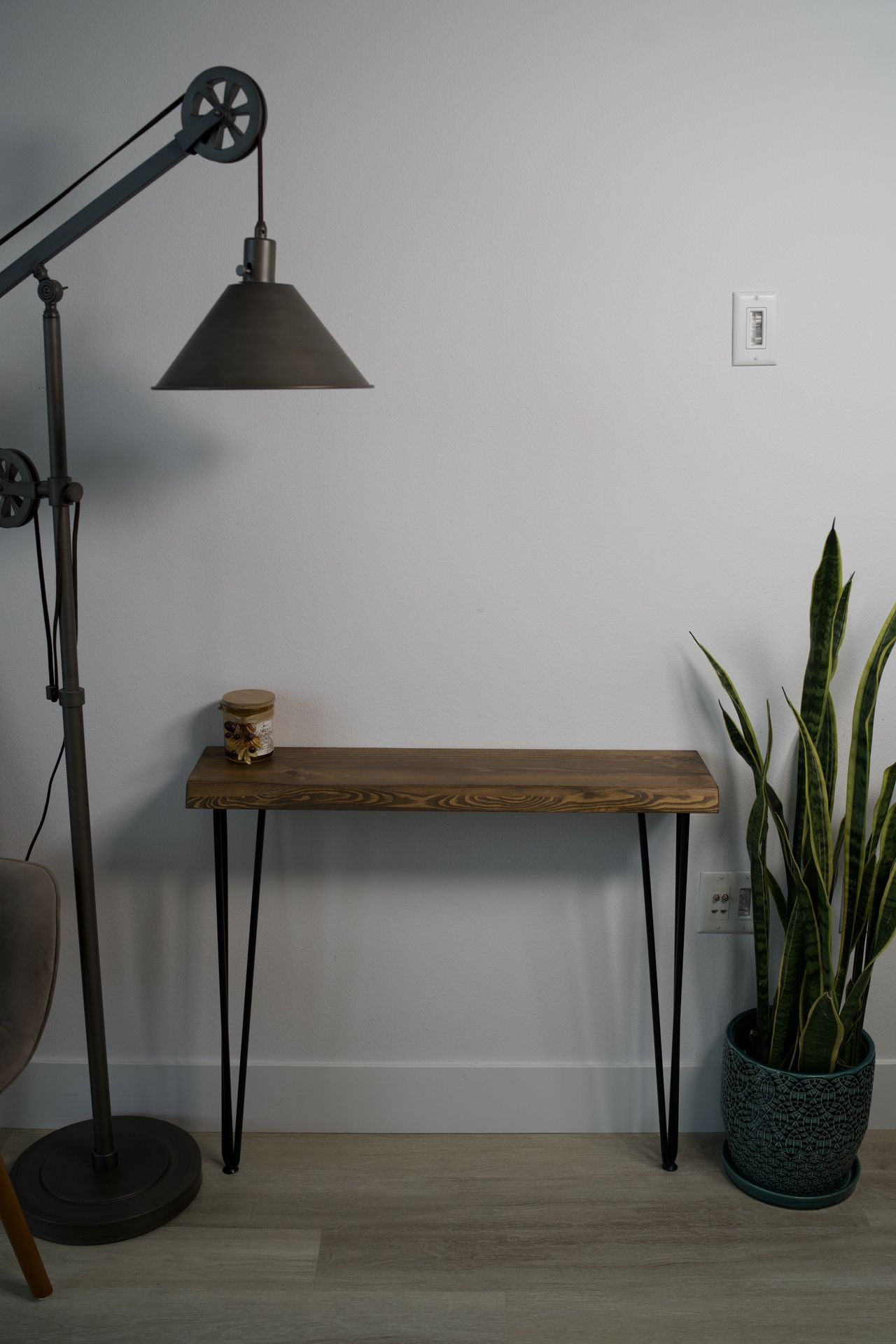 Solid wood live edge console table Size 34x8x30”H Hairpin legs
