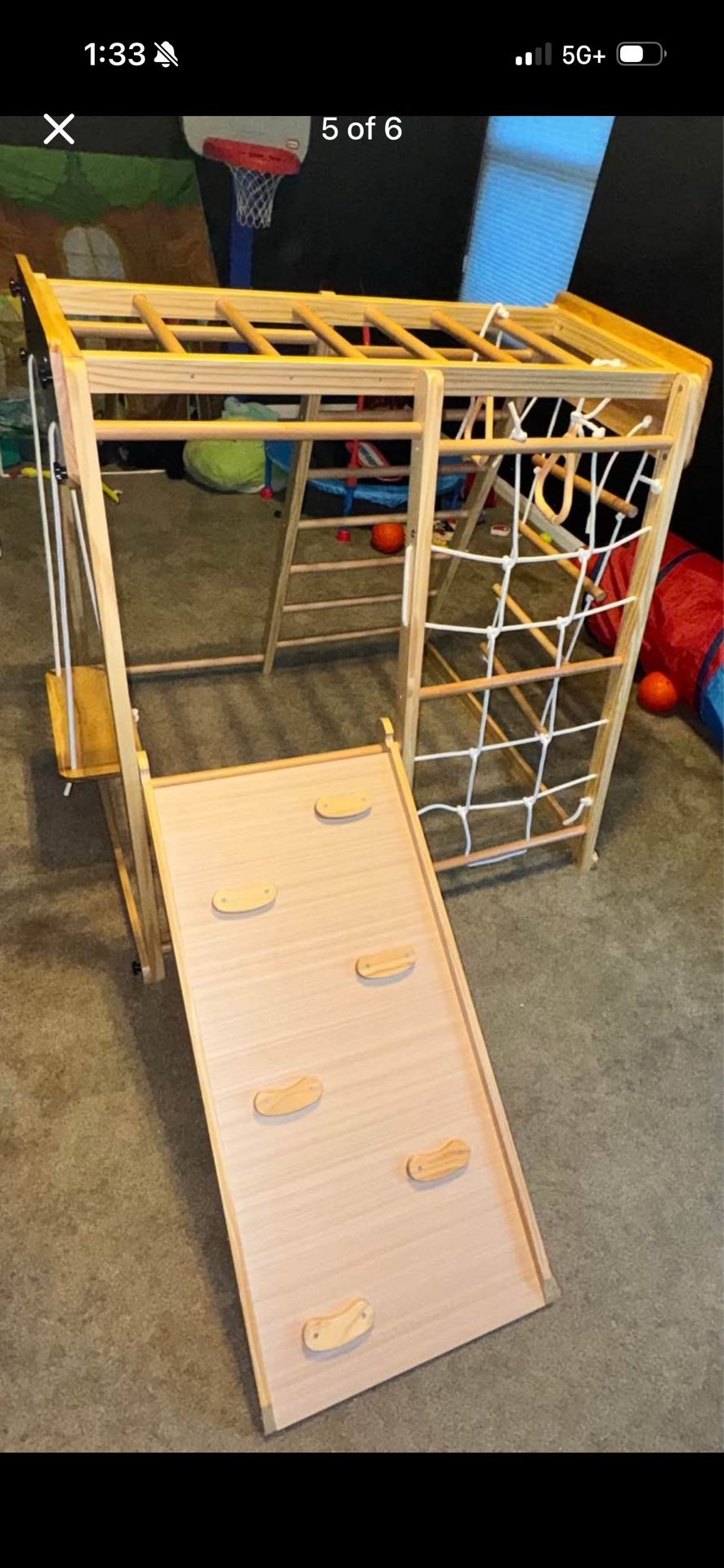 4ft x 4ft Has net ladder, regular ladder, swinging ladder, a swing, monkey bars across the top, slide/rockwall attachment. Meant for children under the age of 5. No damage just a few cosmetic oops (stickers and crayon on the slide part). Price is firm.