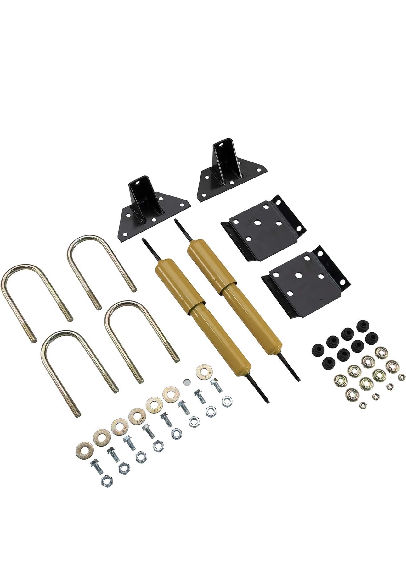 HEAVY-DUTY SHOCK ABSORPTION — Our kit features heavy-duty gas shocks that effectively absorb road shock and vibration. This ensures a smoother towing experience, reducing discomfort during travel BOLT-ON INSTALLATION — The shock mount kit is designed for easy installation. Simply bolt it onto your existing RV or trailer suspension system. No complicated modifications required This flexibility ensures compatibility with various RVs and trailers COMPLETE KIT — Everything you need is included: hex nuts, U-bolts, tie plates, hex bolts, and shock mount assemblies. No need to hunt for additional parts; it’s all in one package boxWhat's in the box Shock Assembly (2) U-Bolts (4) Shock Mount Assembly (2) Tie Plate (2) Washer (8)) Hex Nuts (8) Hex Bolt (8)