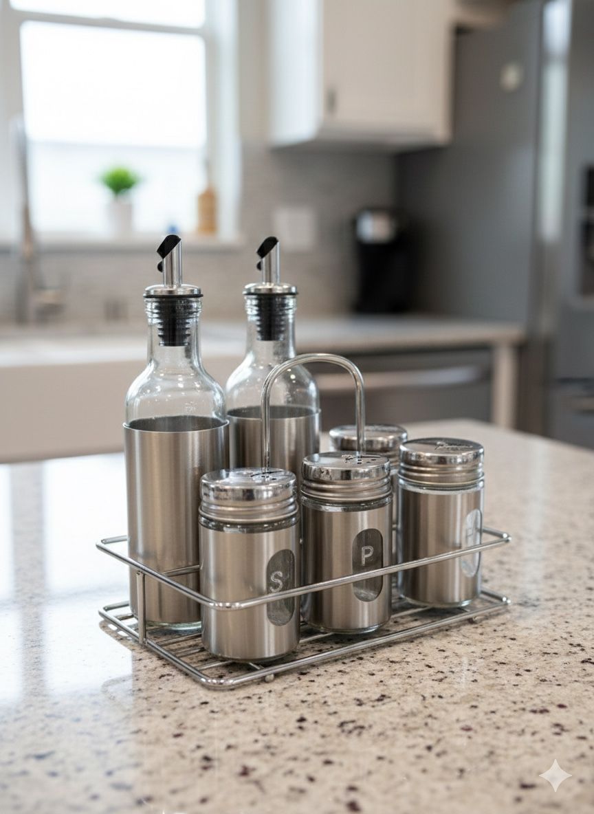 Upgrade your kitchen or dining table with this sleek Parini 6-Piece Stainless Steel Condiment Set. These are made with glass encased in durable stainless steel, featuring clear windows so you can easily see when you're running low. Set Includes: • 1 Oil Dispenser • 1 Vinegar Dispenser (with easy-pour spouts) • 2 Salt & Pepper Shakers • 1 Spice/Herb Jar (spinning top with small, medium, and large holes) • 1 Display-n-Carry Rack for easy transport Condition: New in box
