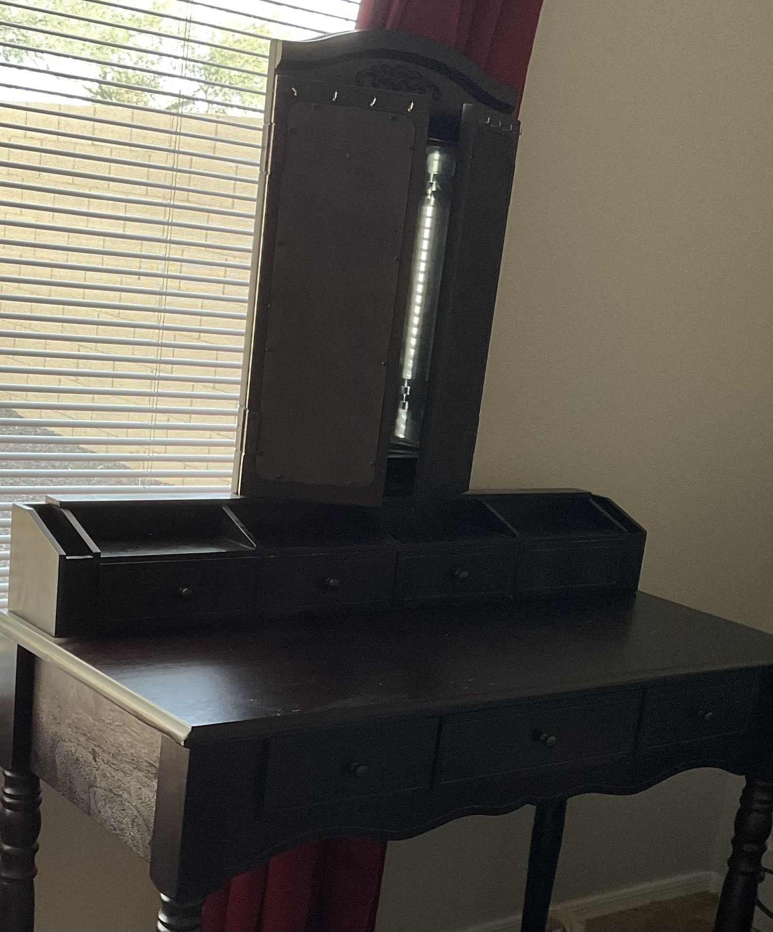 Note: It is a moving sale, price negotiation for serious buyers Description: Makeup Desk with exquisite vanity table mirror, bringing you a whole new makeup experience. Powerful Vanity Storage Space Perfect makeup vanity features 4 drawers on the top part and 3 convenient tabletop drawers. These drawers offer ample storage space for organizing makeup products, perfumes, lipsticks, lotions, makeup brushes, hair accessories and more, keeping your tabletop tidy and well-organized. Unleash your beauty and enjoy the fun of makeup! Durable Material & Sturdy 2-1 Design, Detachable tabletop allows you to transform the makeup desk into a writing desk. Makeup table is made of durable hardwood and MDF material , ensuring a long service life with sufficient stability and safety. Spacious wooden stools with soft sponge cushions for ultimate comfort.