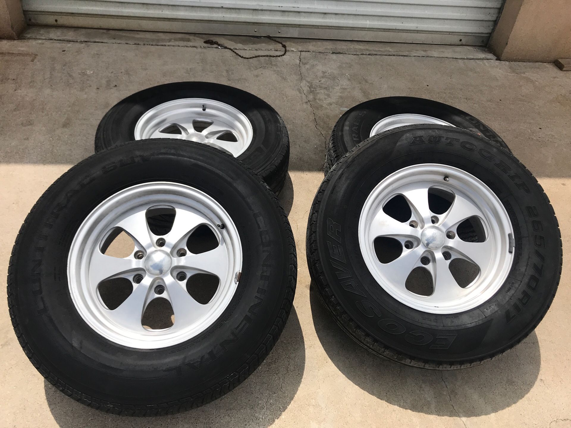 4 billet eagle alloy aluminum rims. One is missing a center cap. Tires are 265/70/17. They are good for a bit but would need to be replaced soon since they are dry. Rims are not cracked or leak.