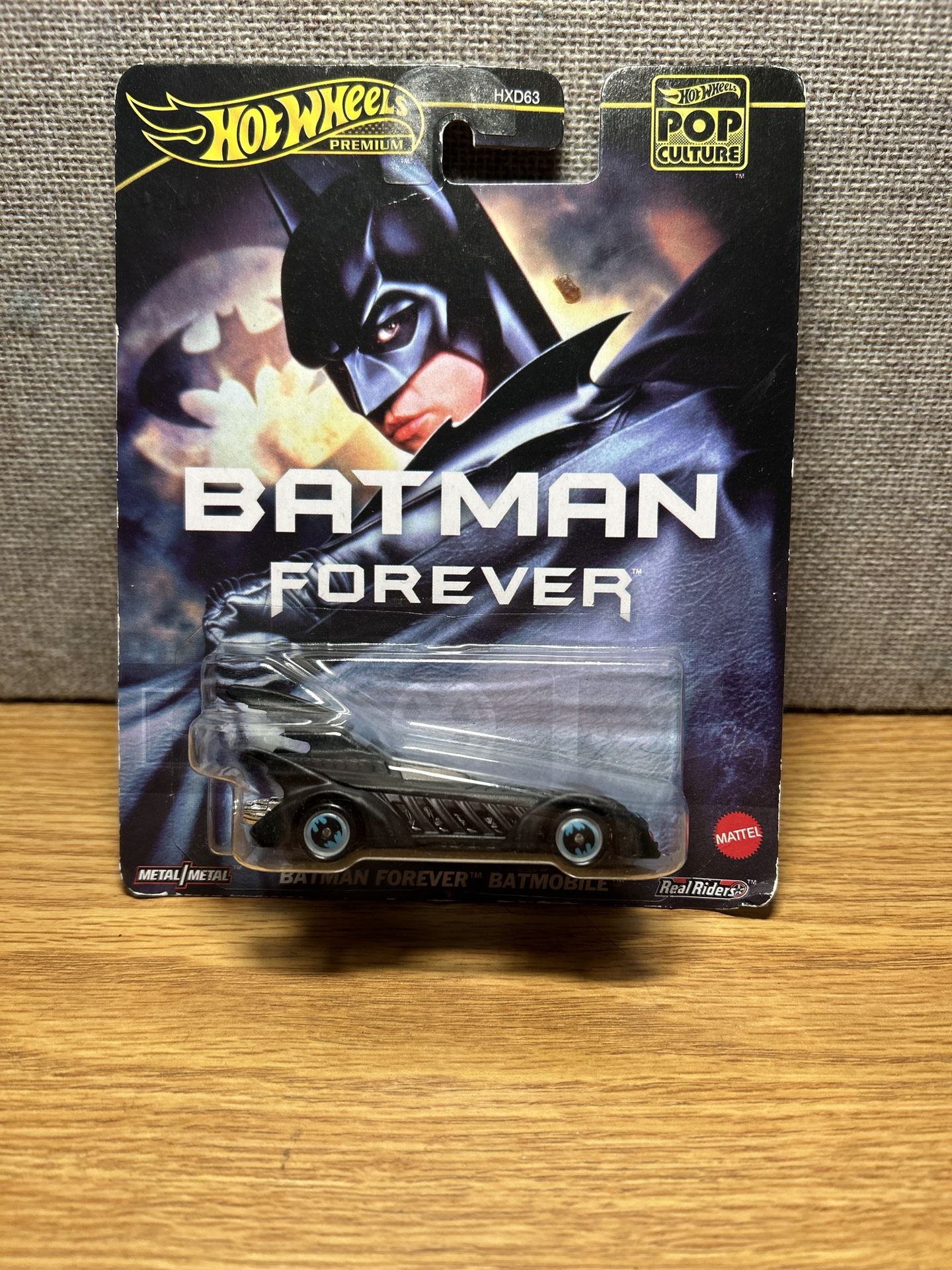 The card art features Batman from the 1995 film Batman Forever, shown in a dark, dramatic pose with the title “BATMAN FOREVER” printed boldly across the center. The background uses moody blues and blacks, matching the film’s aesthetic. The Hot Wheels Premium logo appears at the top left, while Pop Culture branding is on the top right. Inside the clear plastic blister is the Batman Forever Batmobile, finished in black with sleek, elongated styling and bat-themed details. The car has Real Riders wheels with bat logos on the rims, indicating higher-quality rubber tires. The packaging also highlights Metal/Metal, meaning both the body and chassis are die-cast metal.