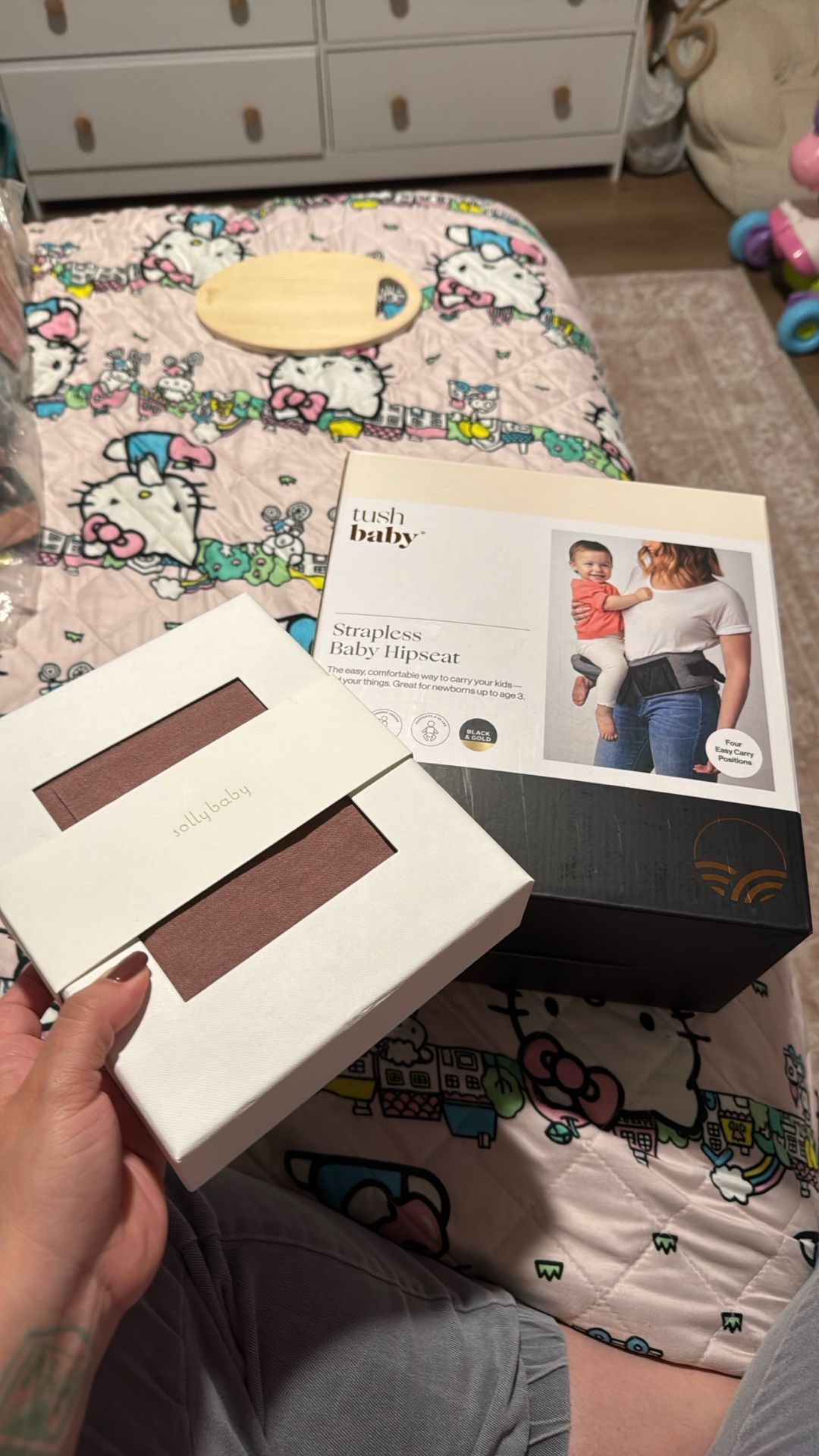 Both are brand new. Never used. The tush baby is black with gold zipper.