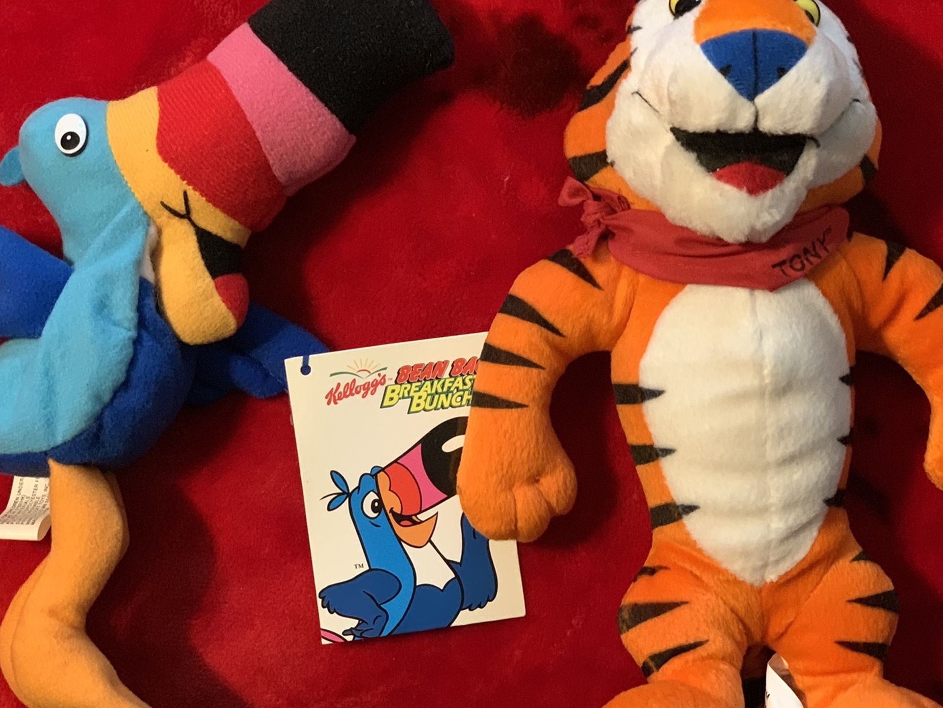 Vintage 90’s Cereal icons Toucan Sam and Tony the Tiger plush. Categories: cereal, collectibles, plush, figures, vintage