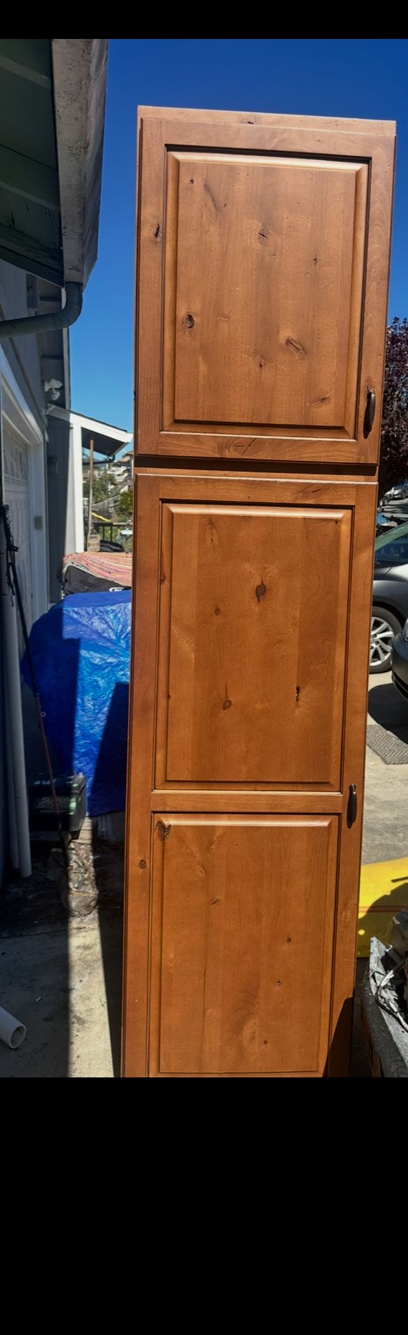 Newport Cinnamon Pantry Kitchen Cabinet, 24 x 84 inches — Plywood construction with four convenient rollout trays. This assembled pantry cabinet features a rich cinnamon finish and ample storage space with adjustable upper shelving and slide-out bottom drawers for easy access. Perfect for kitchen organization or laundry room storage.