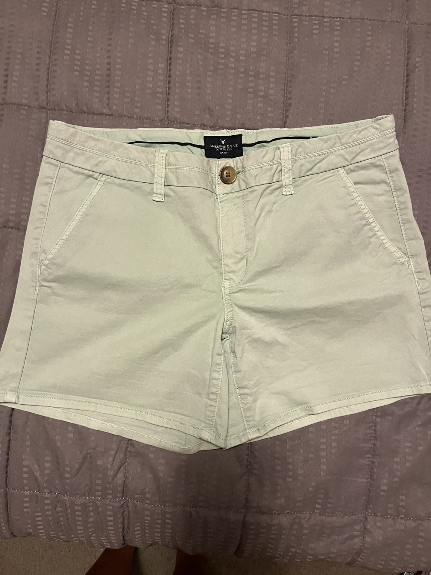 Comfortable and stretchy midi shorts from American Eagle Outfitters!! Size 8. Light green. 97% Cotton, 3% Spandex Approximate measurements laying flat: Waist: 17” Rise: 8.5” Inseam: 5.5” RN# 54485 Made in Bangladesh Thanks for looking, check out my other listings for more styles, sizes, colors and brands to suit your needs and bundle to save on shipping!!