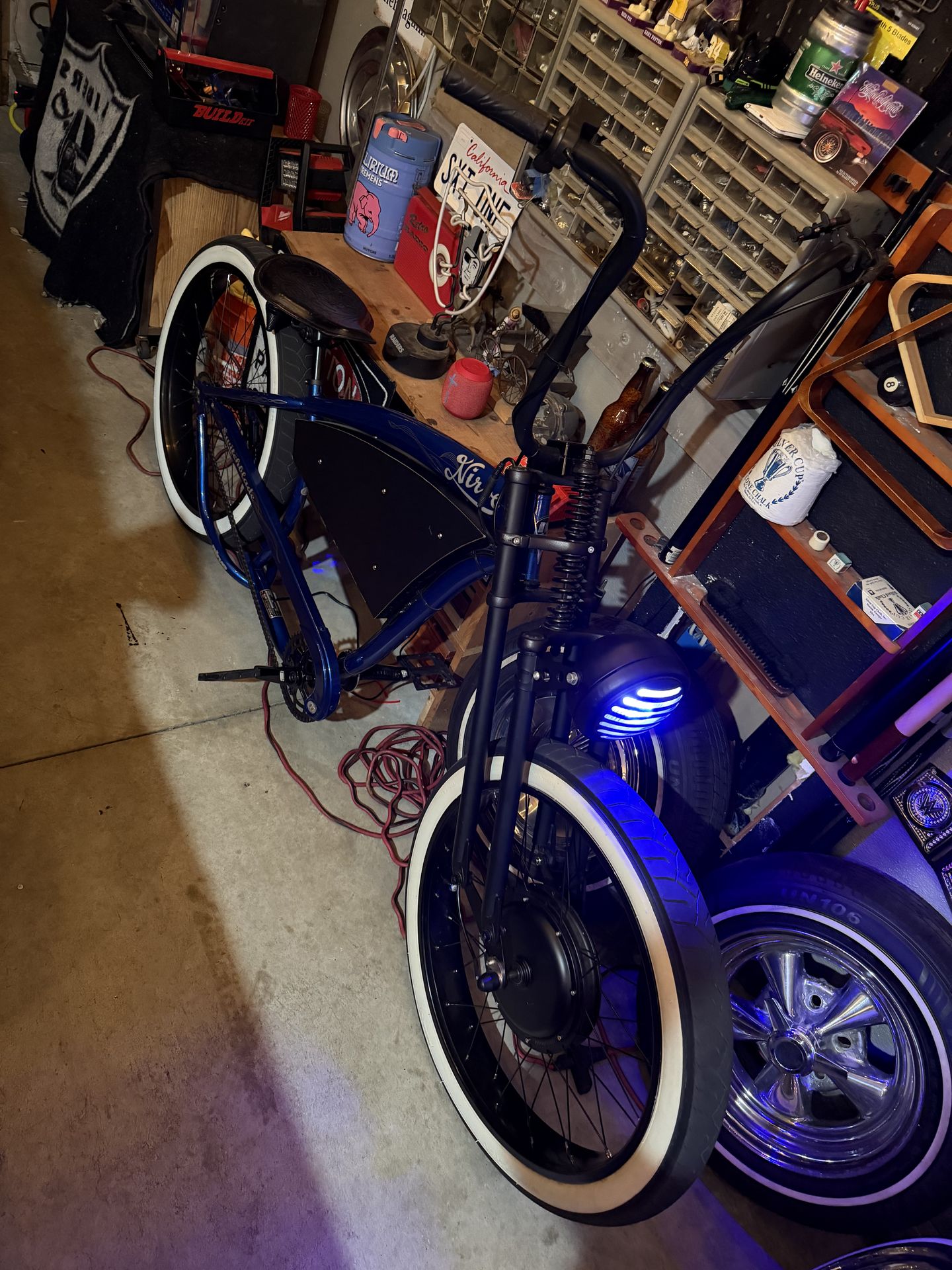 Have this Nirve switchblade frame with a custom front forks and handle bars. Also has a custom battery and wheel with hub to make it electric. Custom seat and pedals goes 30mph with front and back brakes has peddle assist. Has nice led front and back lights to Cruz at night. Looking to get 2k obo or trade for electric dirt bike