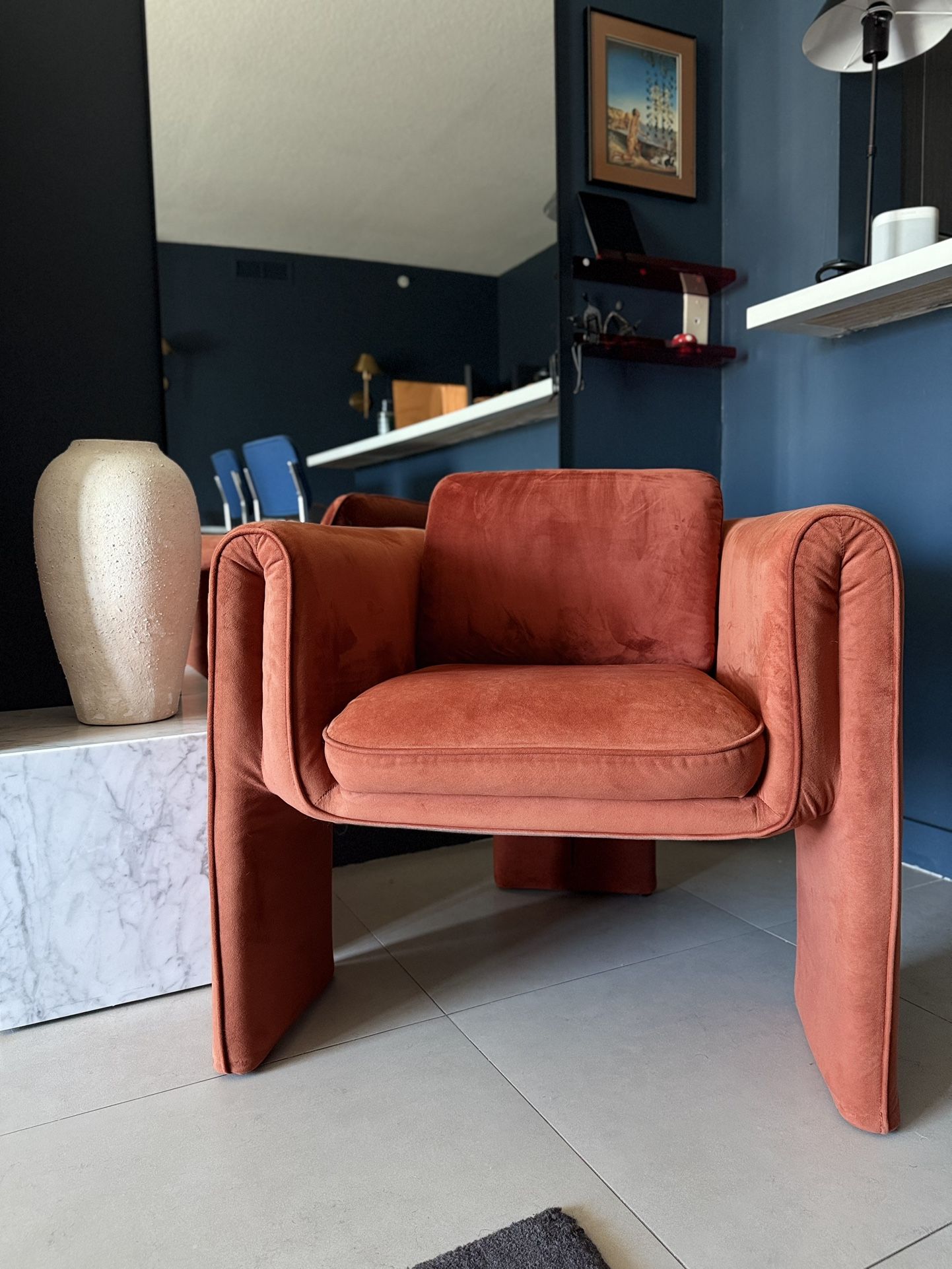Upholstered allover in rich textures, this armchair lends a luxurious interpretation of modernist silhouettes to your space. Tri-leg chair features cushions at seat and back, set on a wrapped and folded structure that feels so fresh and unexpected. Available exclusively at Urban Outfitters. Features Top-rated armchair from UO Home Modern curved silhouette with three legs Wrapped in ultra-soft luxe fabrics UO exclusive Content + Care Fabric, iron, plywood, foam Spot clean Imported Size Dimensions: 31.5" l x 29.1" w x 31.5" h Seat height: 20" Leg height: 24.8" Clearance: 12" Weight: 38.36 lbs Shipping package dimensions: 32.7" l x 31" w x 27.6" h Shipping package weight: 53 lbs Floria Velvet Chair in Terracotta at Urban Outfitters