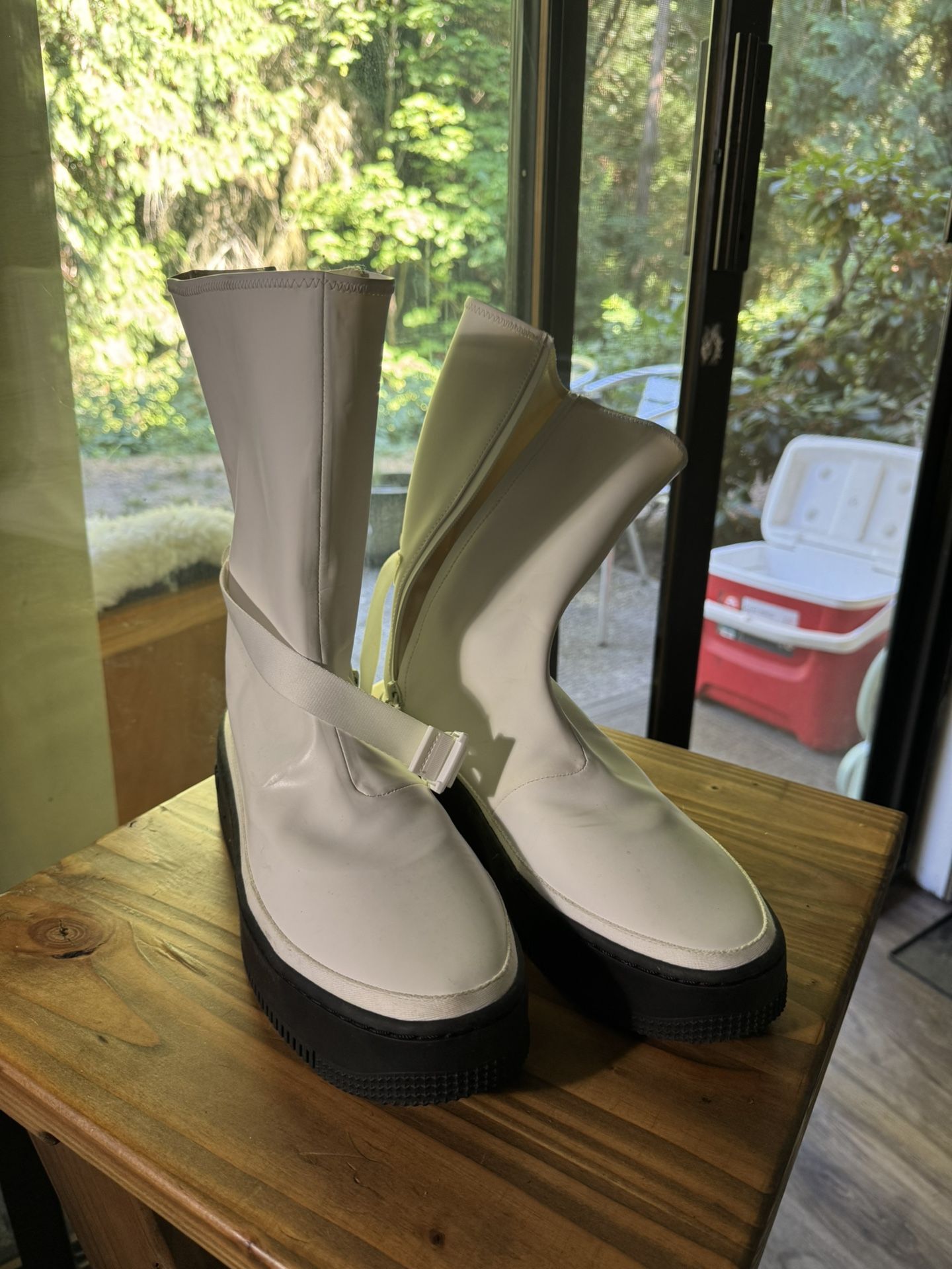 Stylish and bold high-top Nike Air Force 1 boots from the “Force is Female” collection. Rare and limited edition model with a sleek futuristic design and signature Air platform. 🖤 Details: • Women’s size US 11.5 / EU 44 • White upper with black AF1 sole • Zipper closure + side rings + ankle strap • Branded tab: “Force is Female / AF1” • Very clean, gently worn 🎯 Great for fashion-forward streetwear looks or sneaker collectors. 📍Pickup in [Bellevue, WA] (Comparable models listed at $100+)