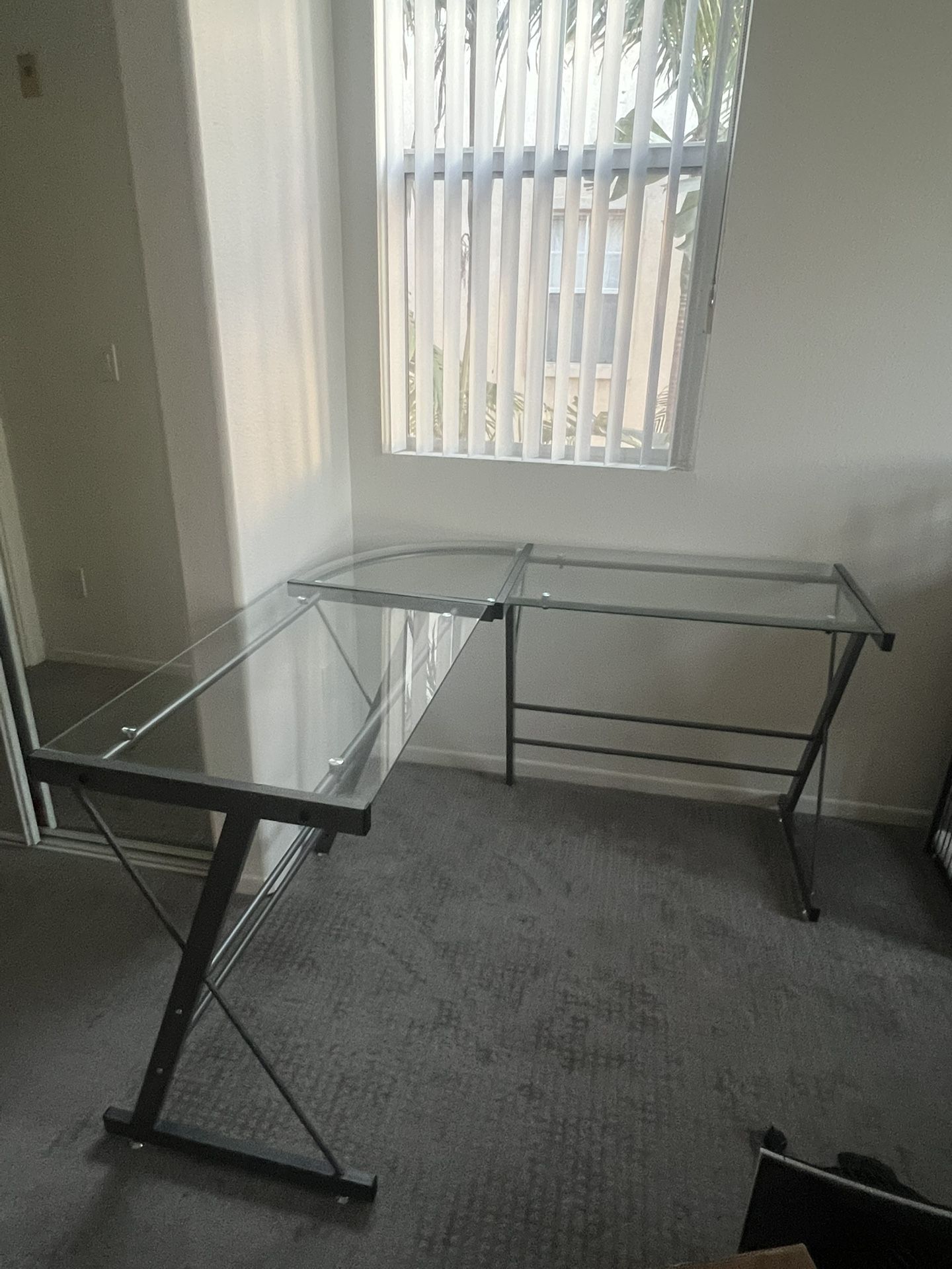 L-shaped glass desk Both sides are the same length, each side including the corner piece is 51.5 inches 30 inches tall From a dog friendly home Already disassembled Pickup in Sawtelle Need gone by 6/27 $40 OBO