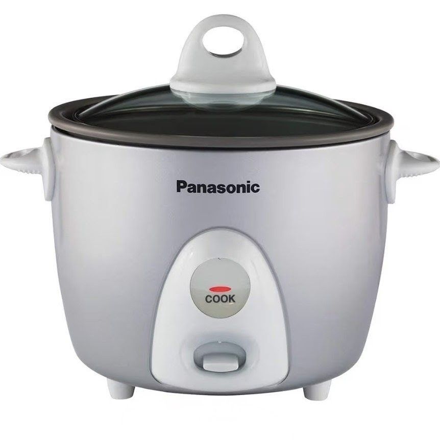 NIB - rice cooker Makes 6 cups of freshly cooked rice and other foods: this Panasonic rice cooker prepares up to 3 cups of uncooked rice (6 cups cooked); use with white, brown, yellow, short or long grain rice and other foods including oatmeal, soups and vegetables One step automatic cooking: simple, one step operation with the push of a button; Includes automatic shutoff function when cooking is complete Durable non stick coated aluminum pan: The resilient, non stick aluminum coated inner pan is designed to withstand years of continual heat and use, and is easy to clean Glass lid with plastic white knob: A tempered see through glass lid with plastic knob lets you safely monitor cooking Included accessories: A measuring cup and rice scoop are included for easy cooking and serving Dimensions: WxDxH (mm) 240 x 198 x 210
