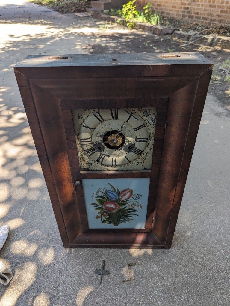 Needs a little TLC not sure what year bottom needs a little repair has hand painted glass in front needs top glass, with wind keys.