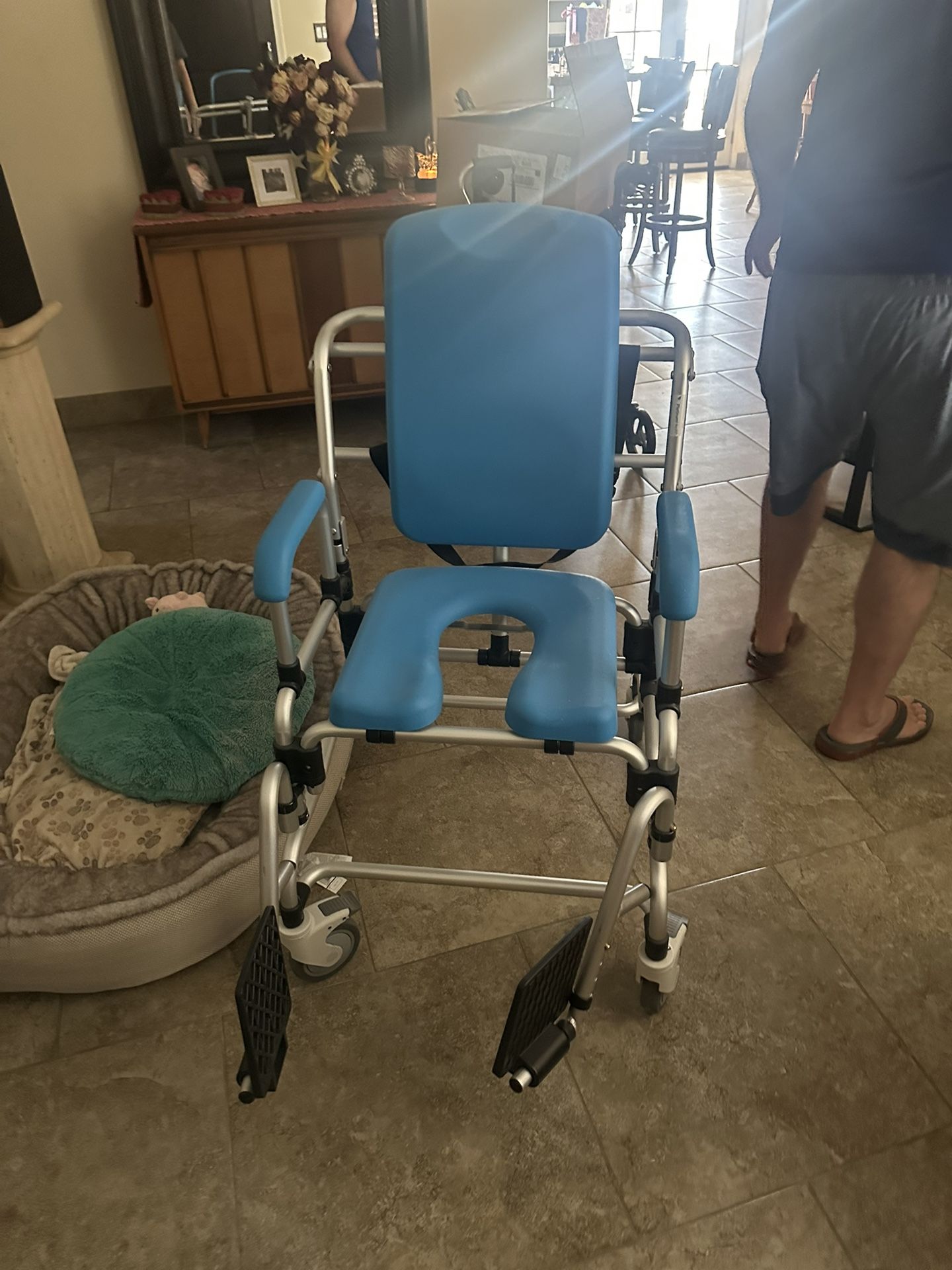 Hospital shower chair with wheels. Can hold a lot of weight and still very comfortable. Nothing wrong with it. Need gone ASAP