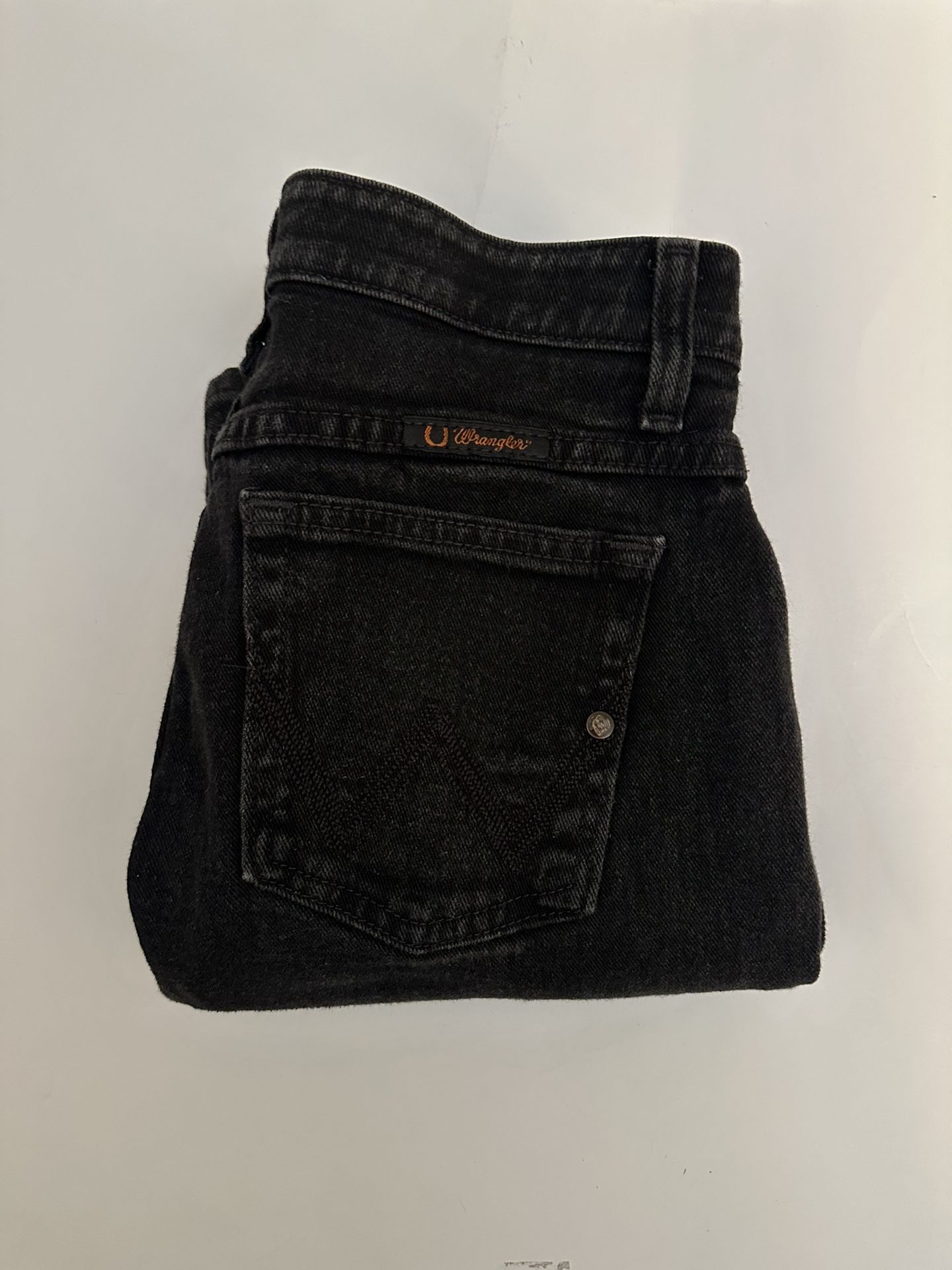 Wrangler women’s Q-baby boot cut black jeans size one, approximately 25 inch inseam measures approximately 14 inches across these jeans are made of stretchy material my daughter outgrew Located in Tracy, cash only