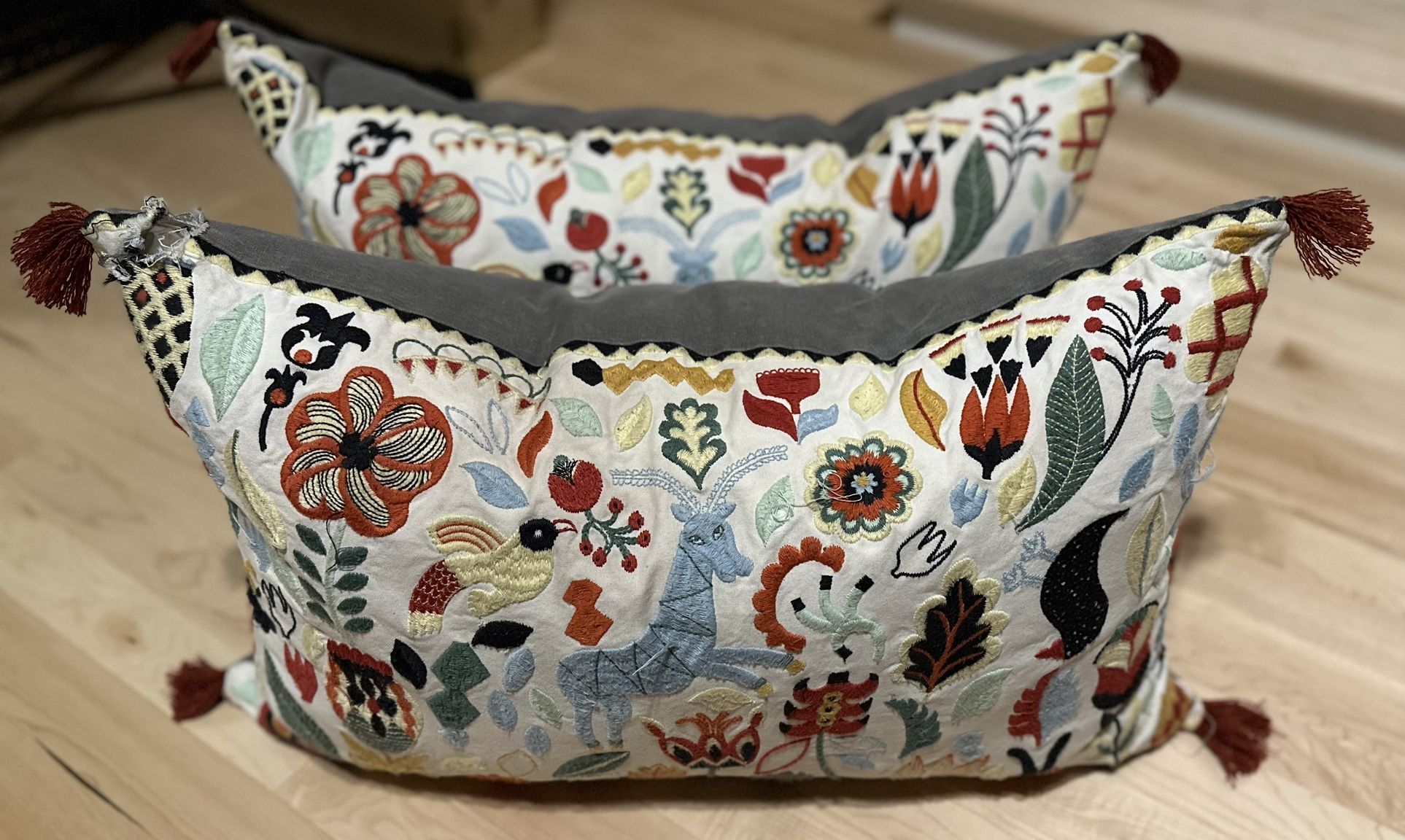 Two colorful, decorative pillows for sale. Down filling. Purchased from Ikea for $65 total. One pillow has a tear in the fabric in the corner (see image)