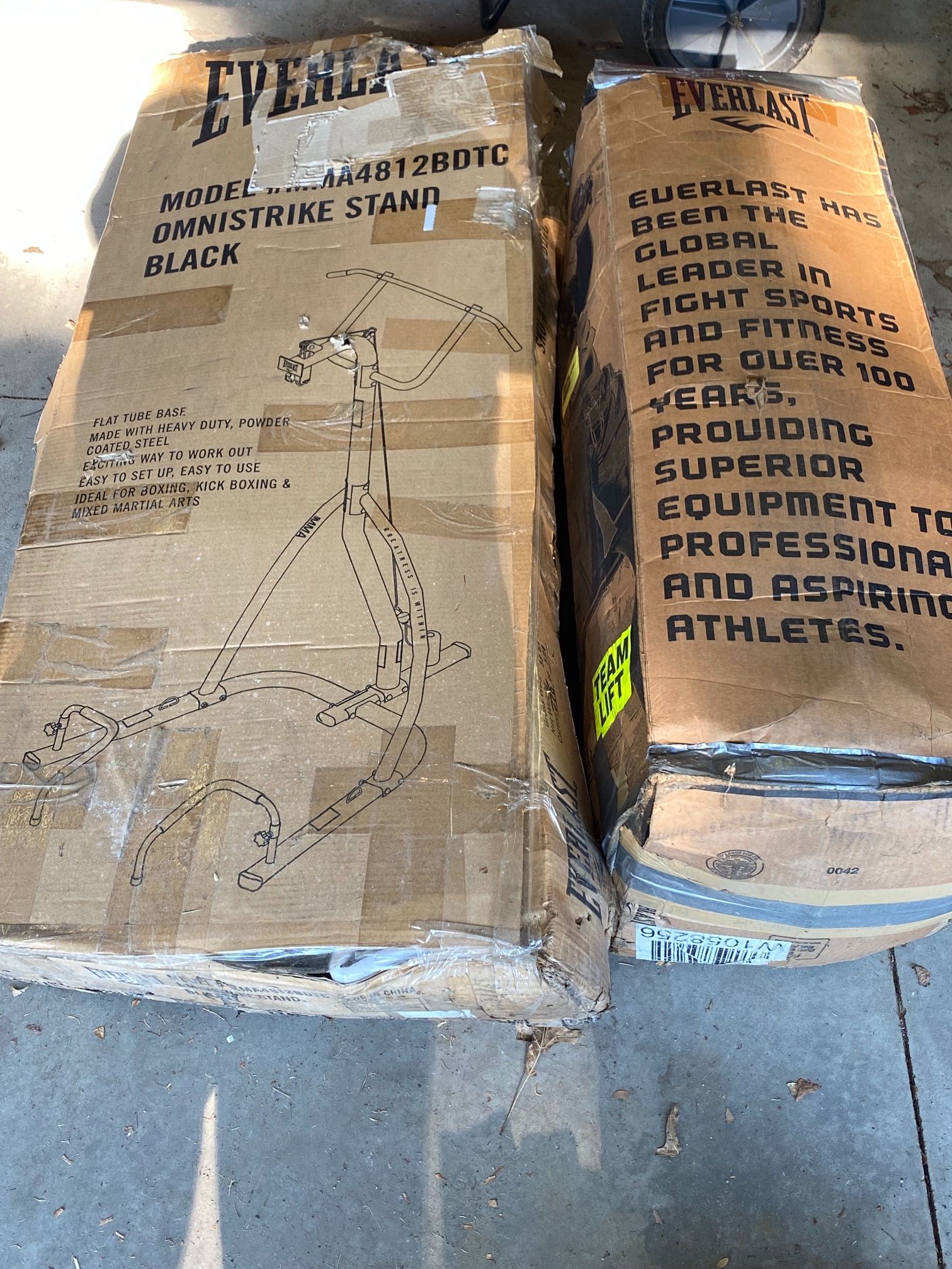Everlast heavy bag and stand both in open boxes. I have not opened either box so some hardware may or may not be missing. PRICE is for BOTH ITEMS! Will not separate at this time. New price would be over $200. AS-IS