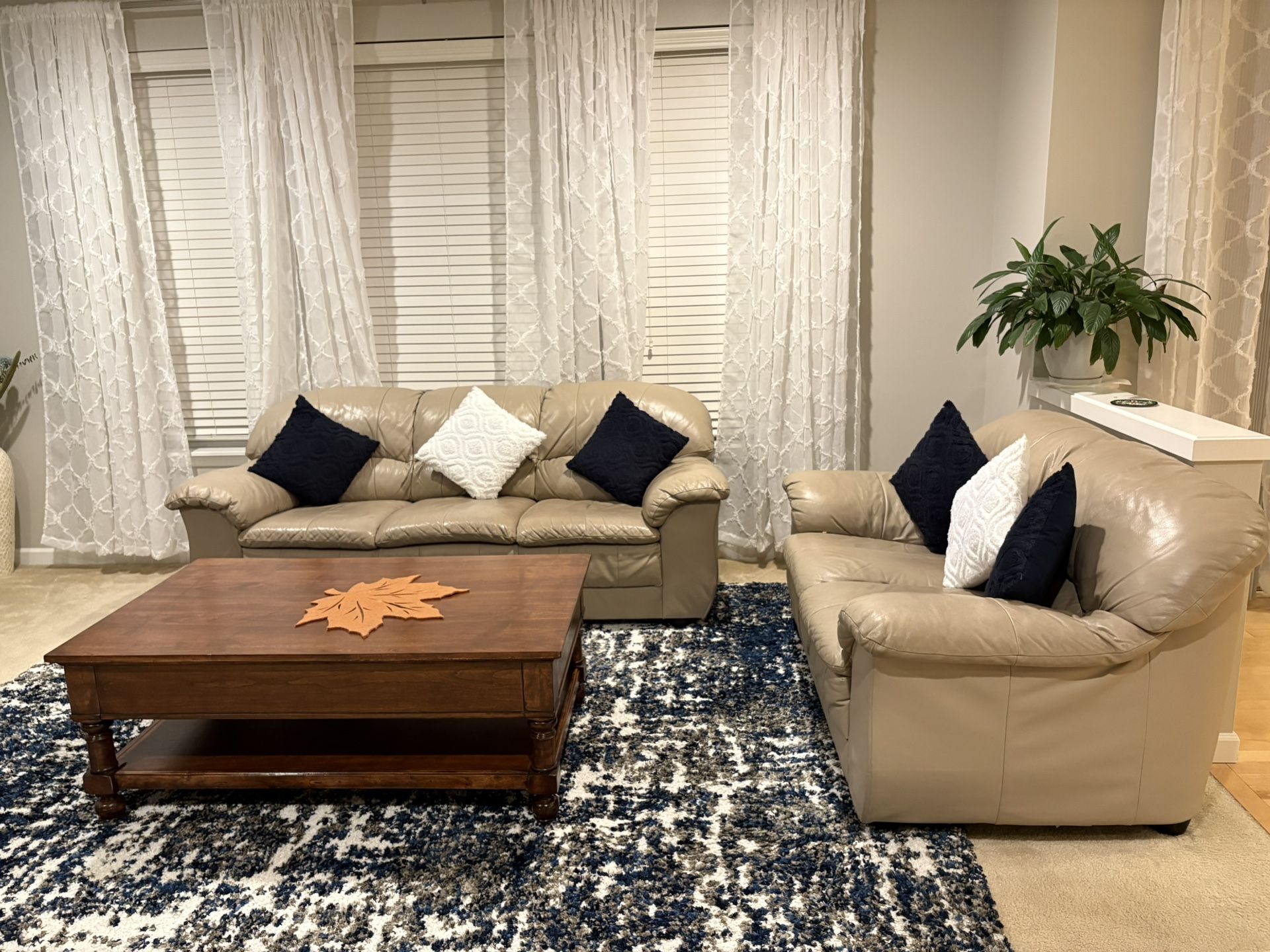 Genuine leather sofa and loveseat. Beige color, very good condition, well maintained. Cushions are in good shape. Very comfortable real leather sofa. Can be enjoyed for many years to come.