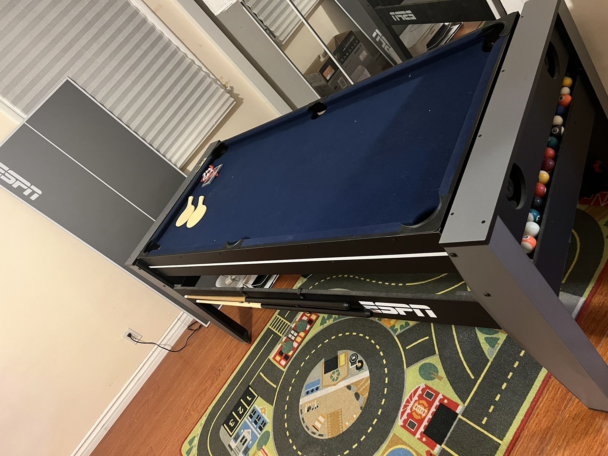 3-in-1 game table: air hockey, billiards, and table tennis. During the move, the air hockey puck was lost (it can be purchased online for about $20, as well as the triangle rack for the balls). In perfect condition with no damage. Original store price before tax was $270. We’re happy to pass it on to a good home for $100