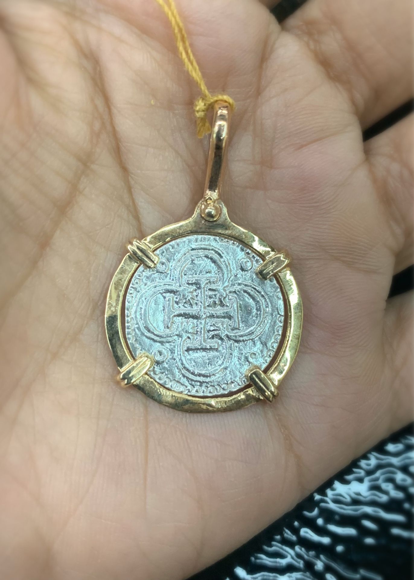 Atocha shipwreck treasure Mel Fisher silver coin pendant in 14k gold bezel