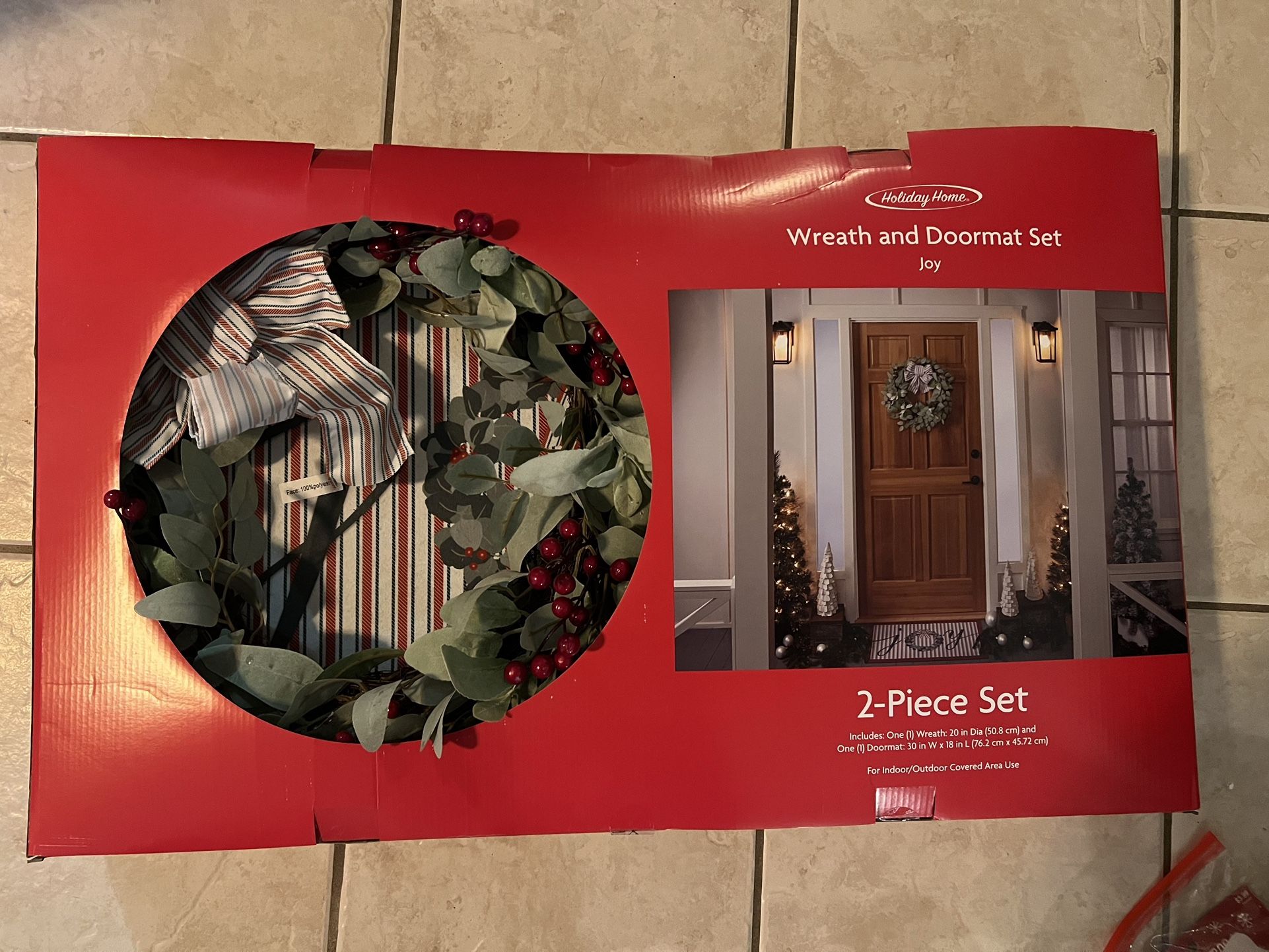 Brand new in box: wreath and doormat set. The doormat is red and white striped with “JOY” with a wreath for the “O”. The wreath is a 20 inch eucalyptus wreath with berries and a red and white bow. Super cute set!